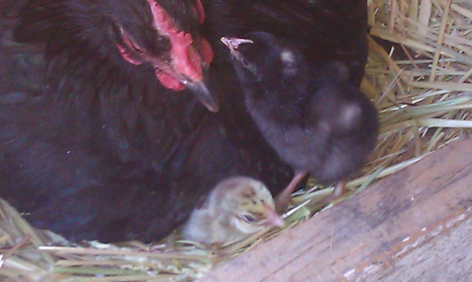 I.....have..... BABIES!!!!!!! One SPW and one that I believe can only be Ozzie and my CA Grey's. Now I need to know if Delaware over a cuckoo pattern with cuckoo patterned parents would produce a sexlink and would the boys have the head spot? Because that is what this is looking like. Plus he is such a BOY...pecking at mama's eyes trampling the little SPW boldy going where no chick has gone before...that sort of thing. I also have a pip in another SPW egg and maybe more but that was all I could see. at the time. Hoping for a Del Baby and a couple more SPWs but I thought about it last night and decided for me anyway, the excitement and fun of going through a hatch is well worth the 35.00 spent on shipped eggs regardless of the result. I have spent that on an evening at the movies with much less satisfaction. Even if I had ended up with nothing, looking back it was fun just to think about and dream about the potential and there will ALWAYS be more chickens ya know...especially if you spend time on this thread.;) I took a juice lid full of scrambled egg out to the coop and settled in to watch. The babies are still too young though but Beakface ate till she was fulll so that made me happy I had done it. The little black one came out from under her for a bit but really didn't know what to do with the egg. I am off tomorrow and headed over to pick up two SGD girls from Kim so happy happiness in my little corner of chicken world and I will be able to watch and wonder at these new babies.