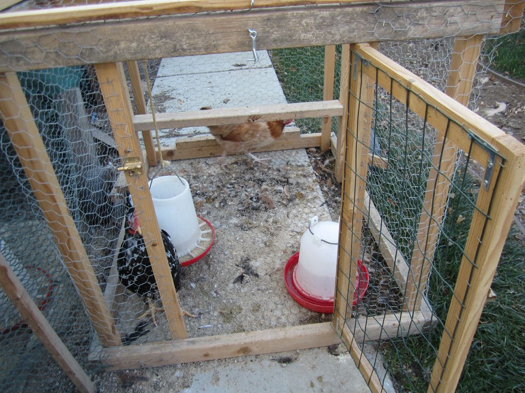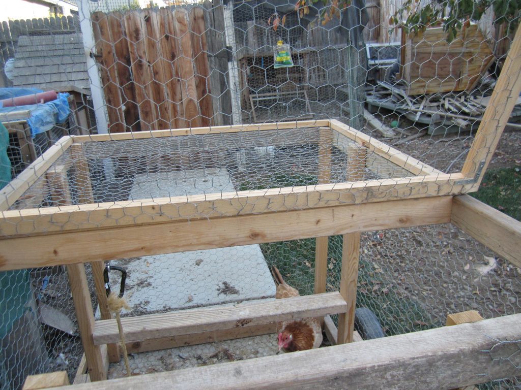 If I had predators, I would add hardware cloth to the bottom of the sides. The floor is chicken wire, so that the chickens can't pull out the grass. I have a 2x4 roost in there too.