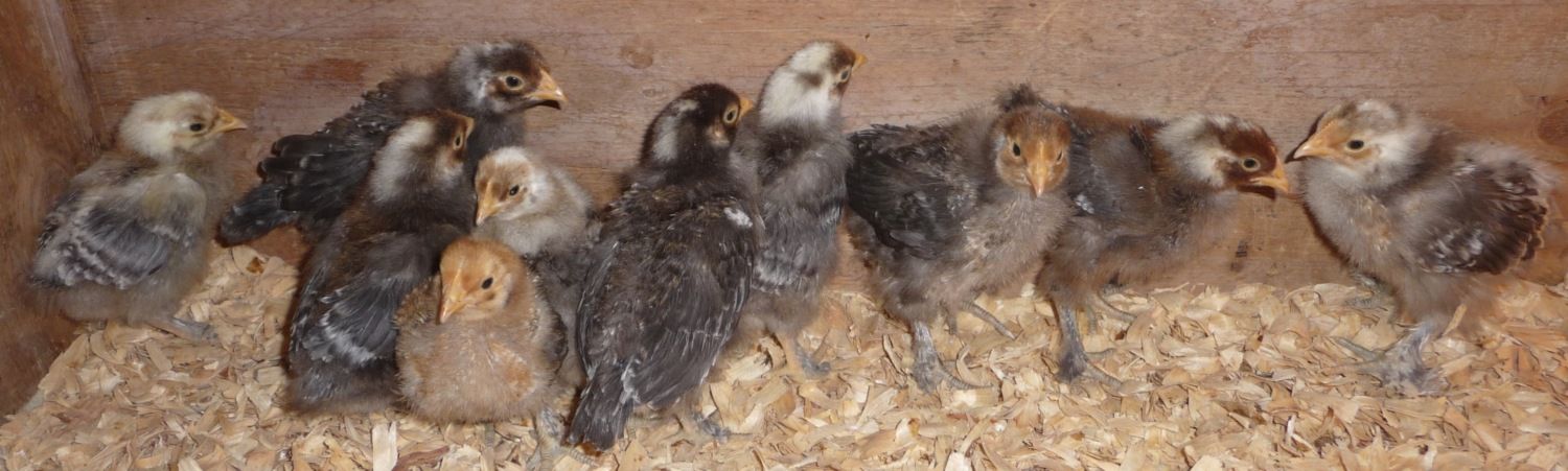They are all so pretty thank you for posting them. I wouldn't mind OE girls if you end up selling them, And those silkies too, yowza! Are you getting snow yet? I am getting slush at 900' and 38degrees.SO sorry to hear about everyones losses!I had a couple of surprises today concerning my chicks! First, the white Silkie chick I thought was a rooster is a pullet! That makes 5 pullets and 4 roosters! The other surprise is just now I went down to take new pictures of my Marans chicks and realized most if not all of them are OEs! I wondered why their colors were off! The GCM pullets were in with the GCM and BW Ameraucana roosters, but the Marans rooster is the boss and I never saw my BWA breeding anyone, sneaky guy! A couple of the rooster chicks are BLUE! That means they will either feather out as blue golden cuckoos or blue wheaten! The one chick that everyone liked that has the gold head appears to be an OE pullet! It will be fun to see what their final colors will be. The blue golden cuckoo rooster chicks will be gorgeous! Here are some pictures of the Silkies and the Marans (OE?) chicks~
