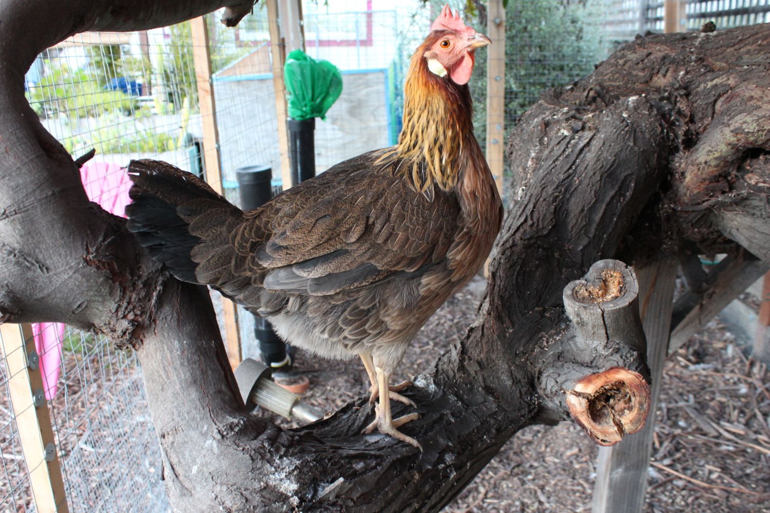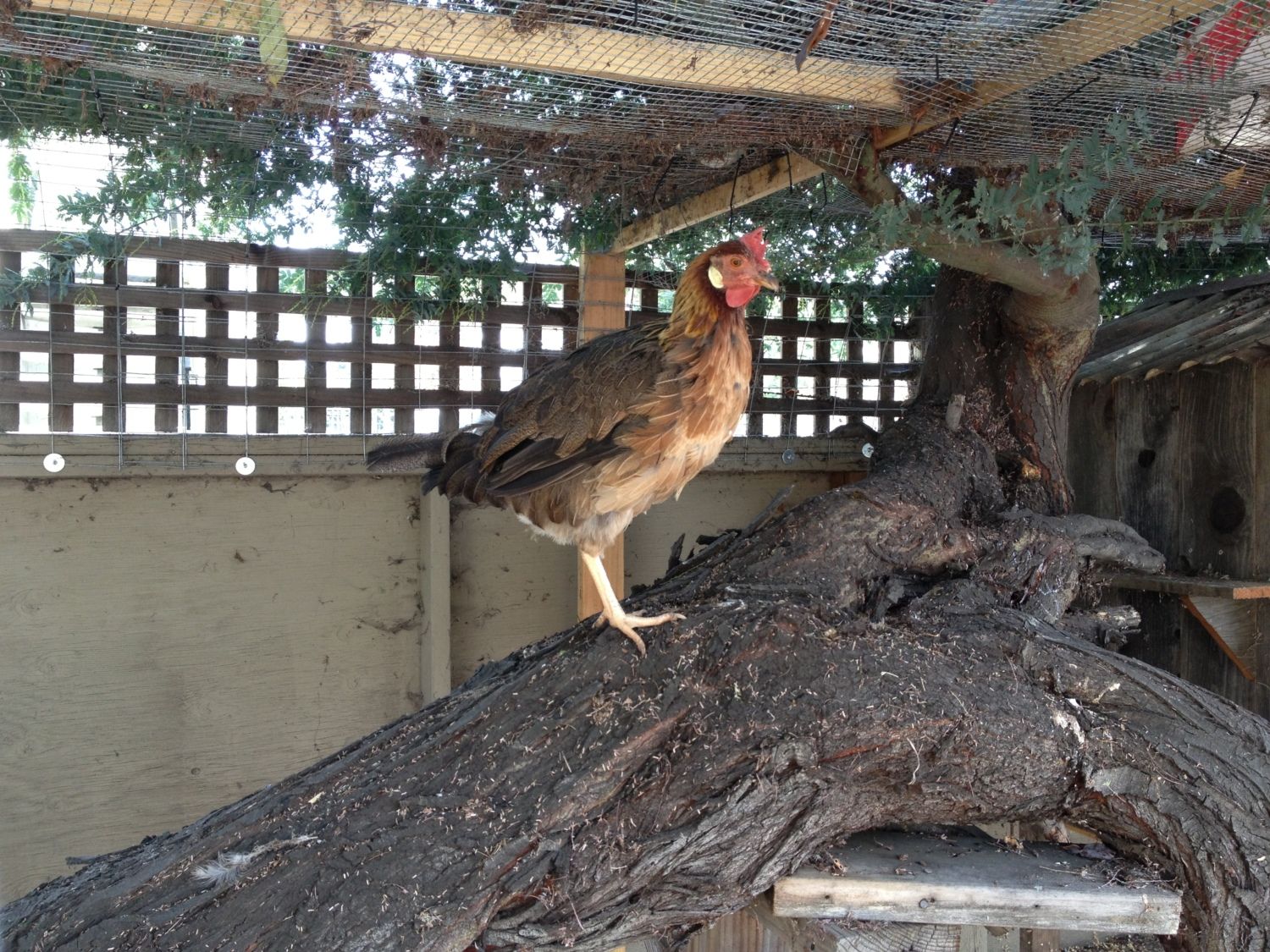 As for our rescue chicken from the neighbor's flock, it's been about three-ish weeks so far and she's just about integrated as bottom chicken. Although at first they'd chase her up the tree on sight, the original 5 have now stopped chasing her as much and they're even letting her scratch peacefully on the ground in the main garden for short periods of time. Emphasis on "as much" because they do like to give her a good chase now and again. She eschewed the coop after a couple nights and now roosts like a gargoyle atop of the flipped-open coop door (even through the rain and windstorm a couple weeks back).