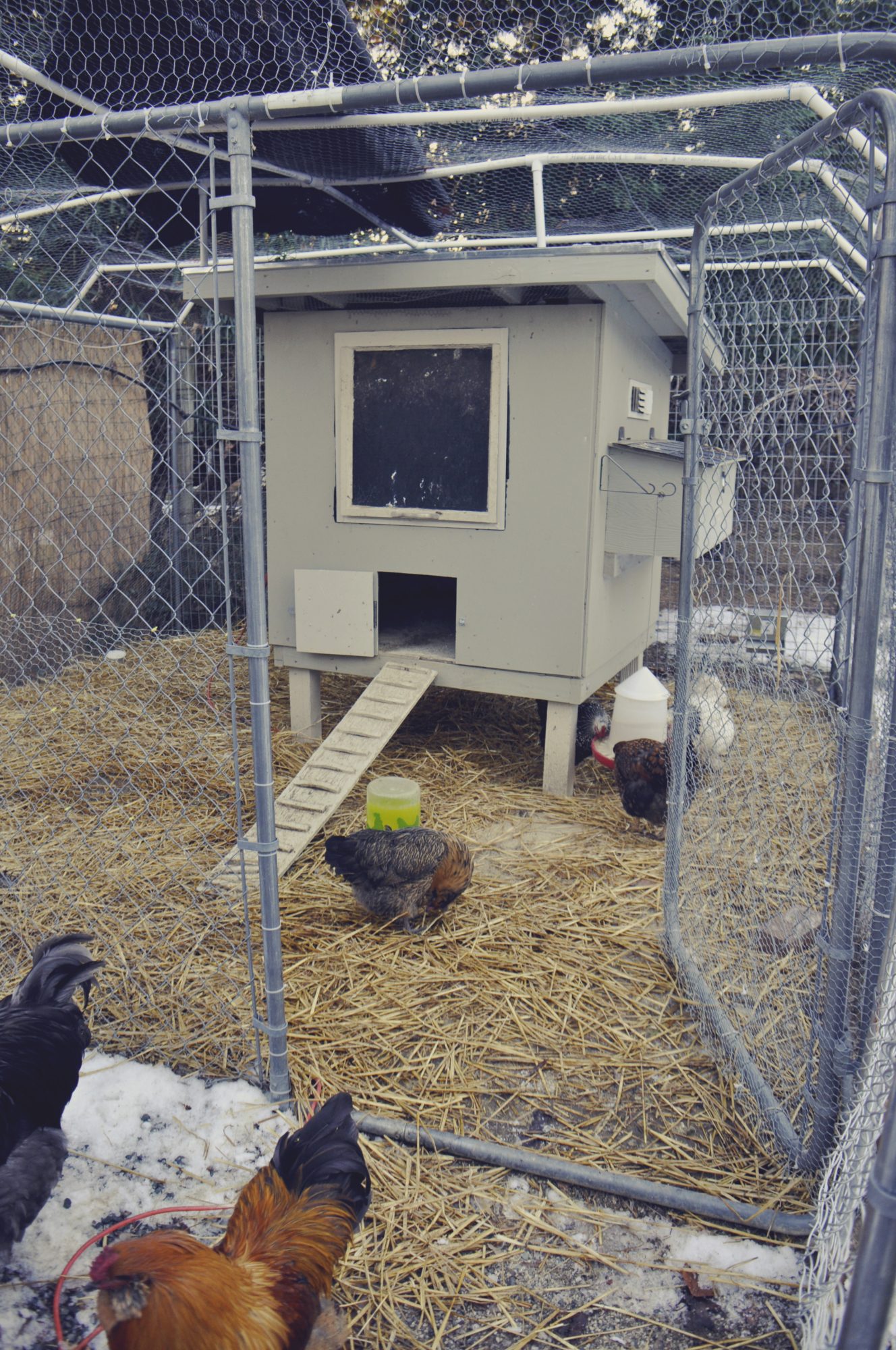 Here's a snap shot of the Bed & Breakfast a couple days ago. All the snow is out of the run area (melted, but still have some in the garden only 5 feet away) and we have put straw down over the sand (cuz it was getting eaten by the clay soil) for warmth and mud control.