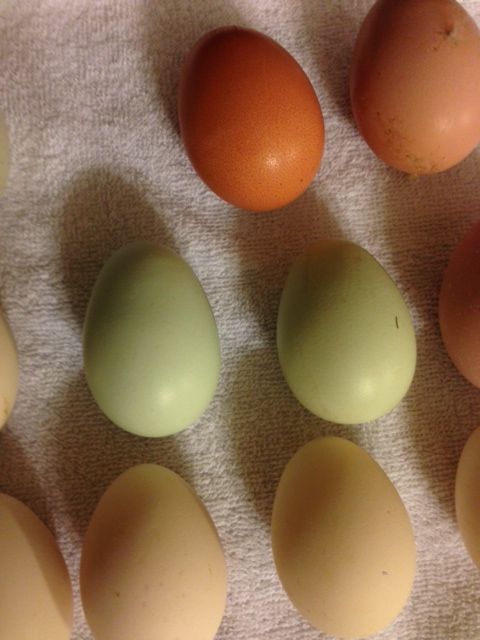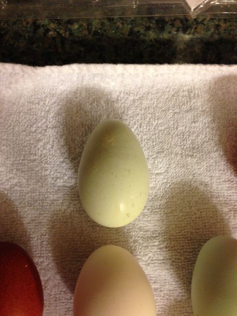 The very first pointy blue/green egg, and I think my Welsummer eggs just keep getting darker! Yay!