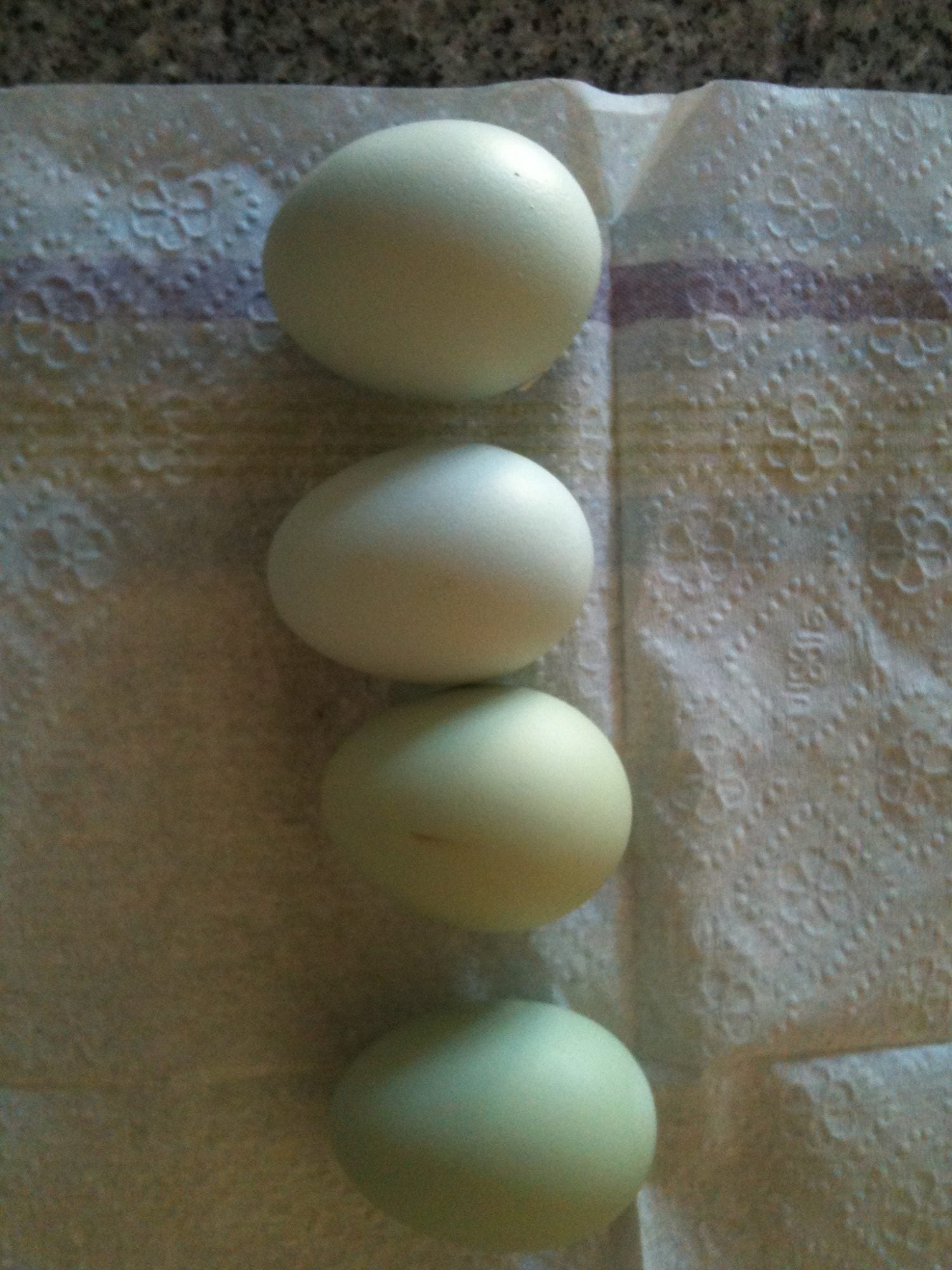 my cream legbars have started to lay!!! at least 3 of these are CL eggs. They are actually blue though they look green in this picture. the top egg was a first egg from one of my girls, so big compared to all the other firsts. I'm gonna have to incubate from her in a week or two! so excited