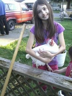 [COLOR=000000]I think maybe I've got someone pretending to be a rooster...[/COLOR] Quiche has a not-bald ('tis fuzzy, but the outer feathers are gone--I know it looks like skin in the photo, but she moved) spot at the top of her neck, just under her skull, and Curry's back feathers are just fluff. They are the only 2 that have any broken feathers--then again, 2 out of 5 is 40%... The 3rd photo is to show that she used to have feathers all the way back... Now for just fun photos! My 10-year-old holding Omelette. 10-year-old being a monkey, 5-year-old copying (she's the one that brought the stool over) and Omelette appearing to think they're nuts