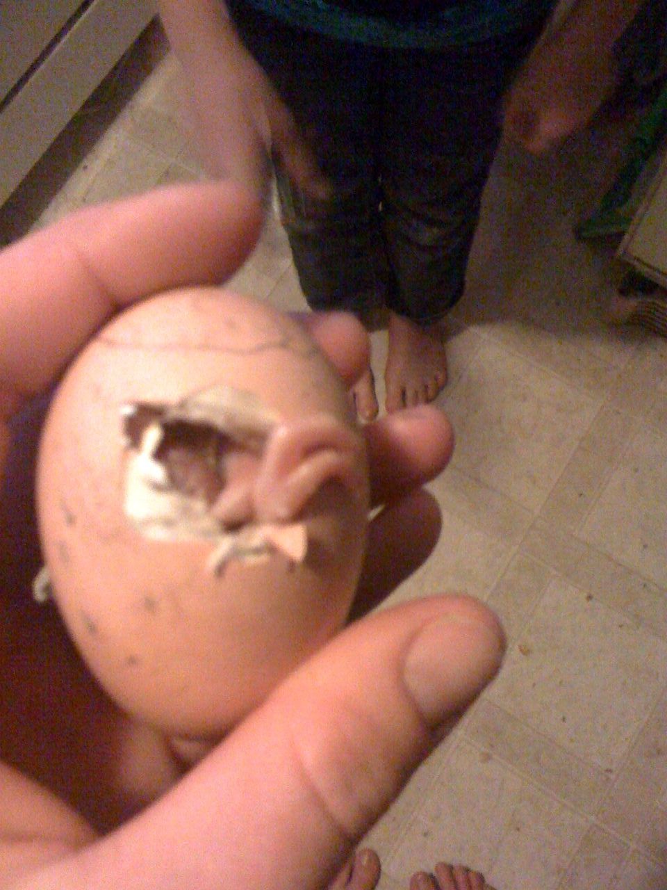 I found this poor thing in the bator this morning, just like that, with her foot sticking out. I helped her out, but boy was she mad. No wonder she couldn't get out.