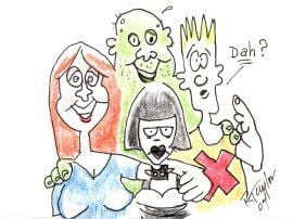 My DH has been an artist too in the past. He also does the "comis book t He especially liked somewhat "naughty" drawings. He/we were furniture movers when we first got married and some of the postcards he used to send me when when he was on the road....well...let's just say I'm am surprised they made it thru the Post Office. He had a heart attack in 2002 and he kind of lost the urge to draw. He still does every once in a while, but it is usually much more "Family Friendly" now. This is probably one of the last ones he did and it was about 6 years ago or so. This was his interpretation of "The Family"