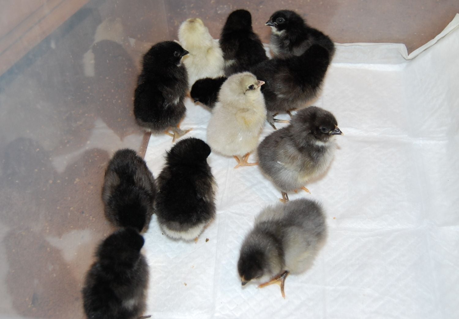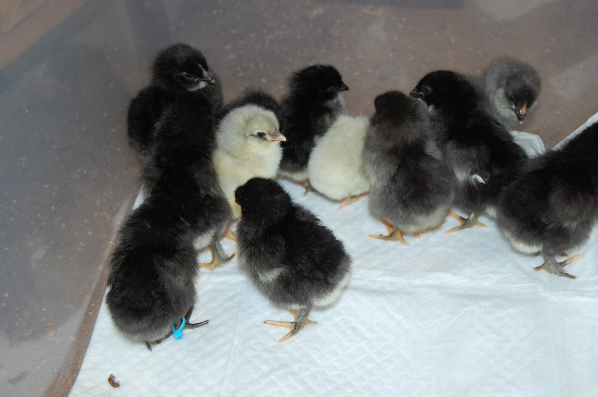 I'm not 100% sure on the breeds (an theither is the person I hatched them for). There should be 6-7 BCM. 3 hatched from blue eggs and 3 from green/olive eggs. This was her "recollection of what they were : "The chocolate brown eggs all came from a pen with the BC Maran rooster. (But she doesn't say what the hens were--assuming BCM since they were chocolate ) The green eggs could have come from his pen too or they could have come from a pen that had a Americana Rooster." The light ones hatched from blue eggs, the grayer ones are from brown eggs.