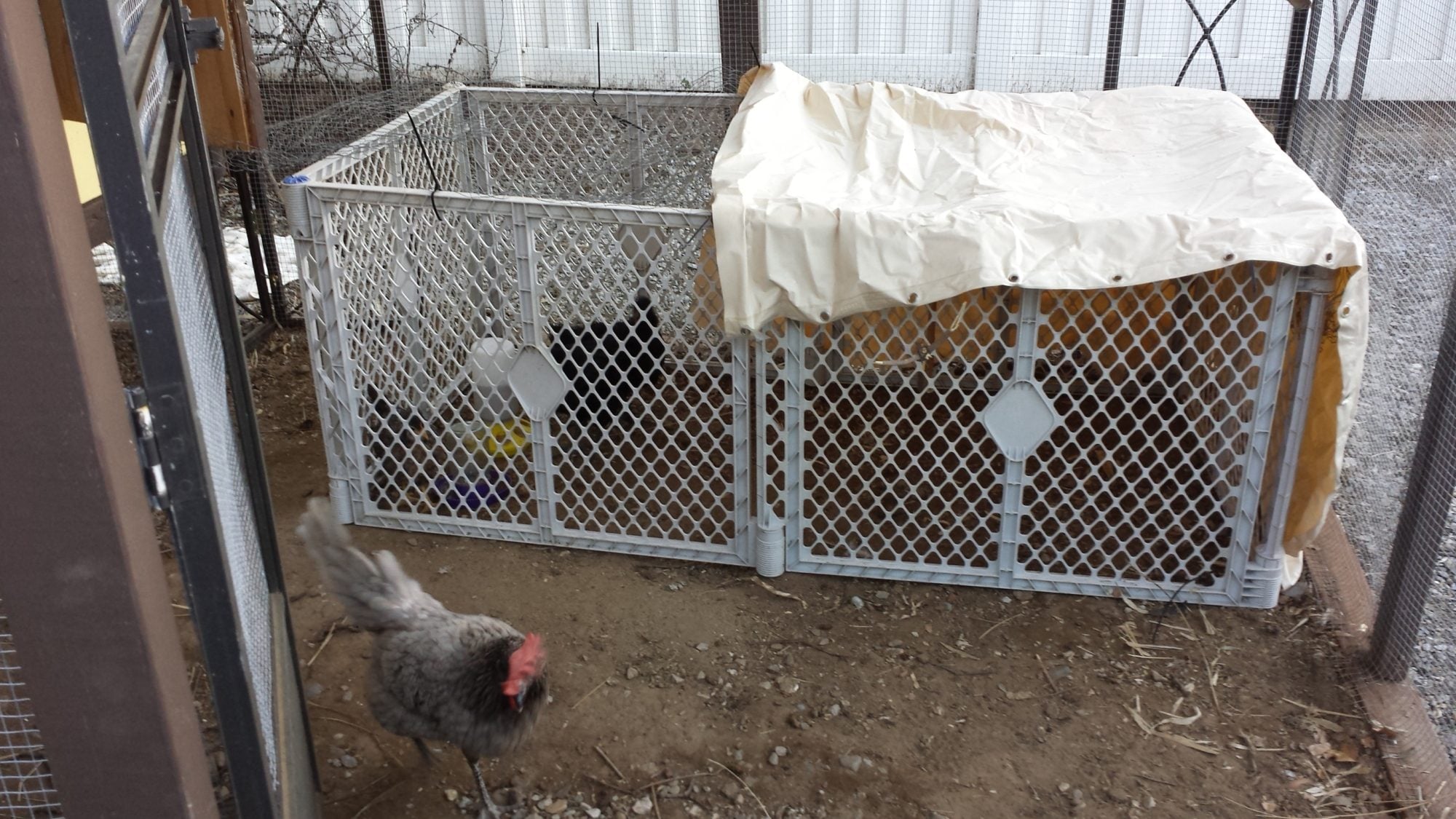 A temporary pen has been all set up for the little ones, so they're now officially living outside. They'll stay in this pen until they're big enough to live with the big girls. It is housing 3, soon to be 5, babies. This is the biggest I could make it. I put chicken wire on top of it and zip tied it so if a hen jumps on it she won't fall in. It's in a secure, predator proof chicken run. How long will it take for my pullets to be 3/4 the size of a full grown hen? They're about 6 weeks now. BC Marans, Cream Legbar, and Buff Polish.