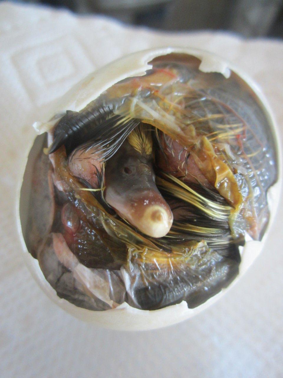 Disclaimer: I am a complete novice when it come to incubation and hatching, but thought some of you might fin this interesting, Pictured below is an egg I found somewhere that's been struggling for days to pip externally, so today I made a hole, waited 12 hours, moistened the membrane and I think this one is malpositioned with it's foot over it's head. Beak is under right wing, but that looks like a toe to me, lol. -Kathy
