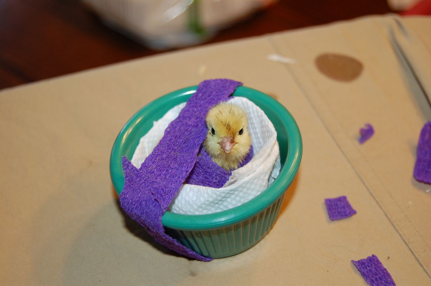 I bought some new Vetwrap ans was able to "hobble" it (that's an understatement. There is the poor thing. She seems pretty comfortable, so I will leave her in this over night at least. I hobbled forst, but then both legs stuck out behind. So I moved both legs into the right posotions and then made a harness of sorts to keep the lgs in a normally bent position. The I put a belt aroung the cup to keep her from popping up and out and undoing the whole thing. I gave her the Nutridrench on a toothpick and then followed it up with a few drops of water. I set the little cup under the front edge of the brooder plate so she can stay warm enough without overheating. She is sooo tiny it is hard to handle her to get her treated. I sure hope this works!