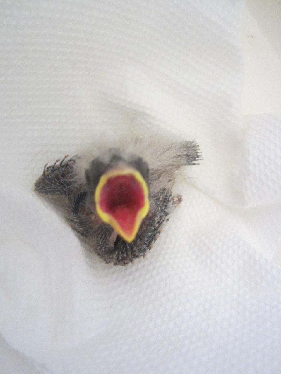 At this stage it still needs to be Crop fed" of sorts. Not actually "in" the crop but in the mouth to the same side as the pictures of the Peahen. I have hand raised a few finch chicks. This one looks about 10-14 days old. They usually fledge at about 21 days and are not fully weaned for a couple more weeks.