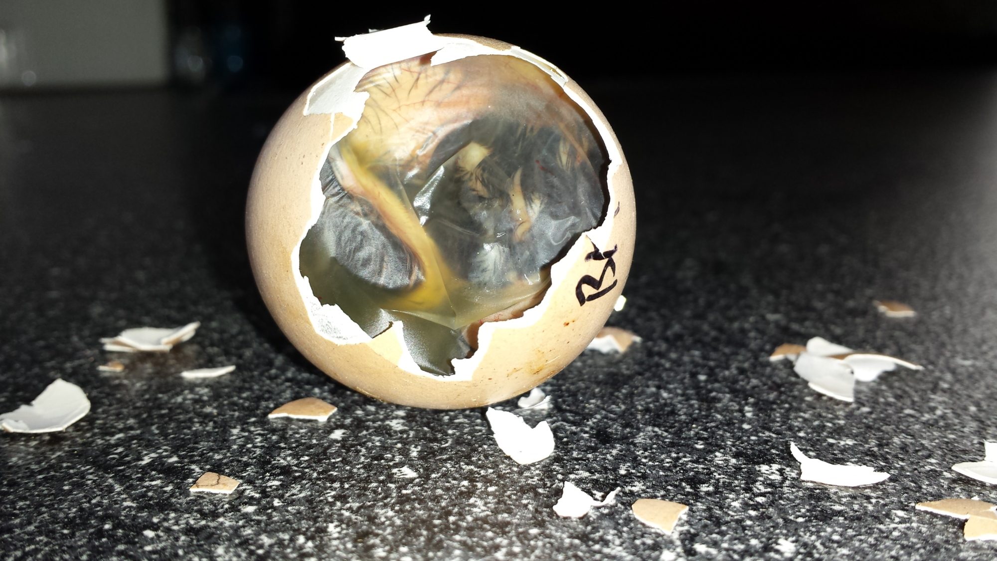 Looks like the TJ egg quit a while ago. Not sure about the Marans can you identify if it may have been mal positioned?