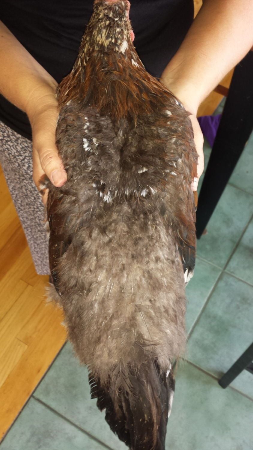Alright, so I brought this up probably over a month ago and never really figured out what was wrong. It's getting worse so I'm bringing it up again and hopefully someone will know what is happening go my birds. Their feathers are breaking so all that's left is the downy stuff under the feathers. It is worst on my Speckled Sussex, the feather loss has now spread up her neck and to the side of her wings. I mean, look how bad this is. She's supposed to have brown and white feathers covering her back, like this: