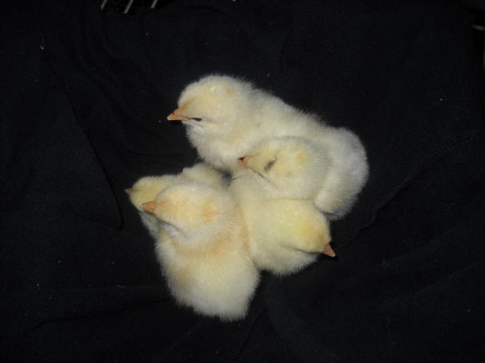 We hatch our own eggs all of the time. But it's pretty cool that these little guys had the odds stacked against them and were almost certain to end on the breakfast table. They just won the lotto! ...unless there IS a boy. He might end up on the dinner tableHe's gorgeous! Wow. I LOVE barred roos, but this little guy is super nice. Here are my Trader Joe's chickies:One of the all yellow ones has bandaid booties. One foot has slightly curled toes, one has VERY curled toes. Hope it helps him. The two at the top of the picture have some black spots, the three closer to the camera are fully yellow. The little one who hatched with the umbilical opening issue has closed up nicely. I wouldn't even be sure which one it was anymore if I didn't know it was the one with the black splotch on his beak. Now fingers crossed that I get some girls!