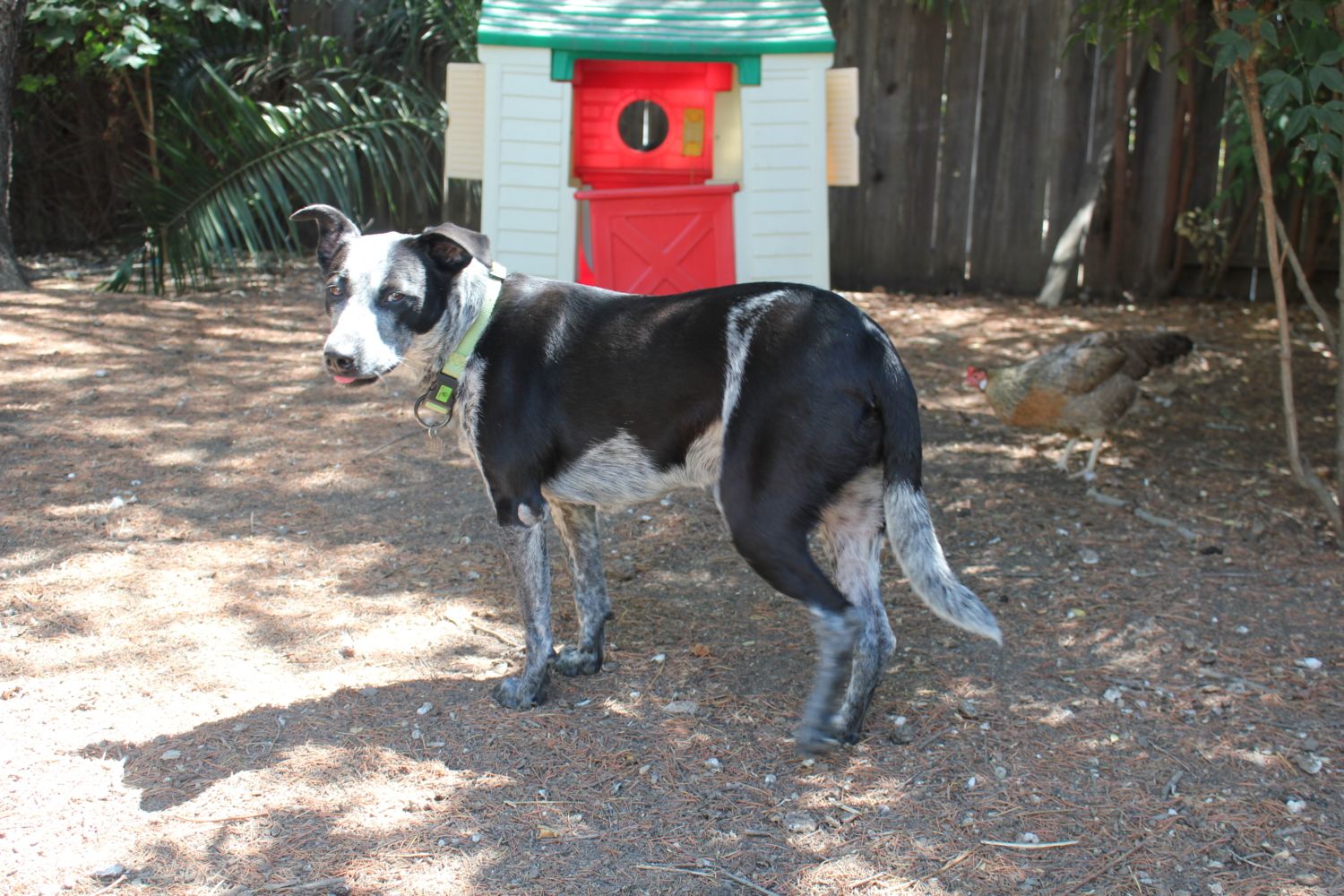 My dog is constantly hunting squirrels in our yard. She has yet to catch one but she will run 5 feet up the Cedar trees trying to get them. Those squirrels know just how close they can get. We have lots of trees in our yard so they run from tree to tree and drive Pixar crazy. She is also a fantastic opossum hunter! I watched her catch a big one and shake it. Last summer, she caught and killed 5 young ones over a period of a couple weeks. This summer the count is only at 1 but it was a bigger one. I went to turn on the water for my morning garden chores and there it was lying on top of the hose. Talk about a shock! We aren't sure what breed she is because she was a rescue dog. The lady who rescued her out in the country by Lodi thought that she was a Catahoula but the vet she took her to thought that she had some Australian cattle dog in her. I do know that she is a header which is more typical of cattle dogs. She looks a lot like pics of McNab border collies. When we first let her out with the chickens, there was a short learning curve that ended with the death of 3 different cockerels but she is fantastic with them now. They are part of her pack. She lets me know when something has upset the flock and runs out to patrol the perimeter of the yard. She has a goofy look on her face (most likely she had just finished eating a recycled chicken treat) but this is the most recent pic I have of her: