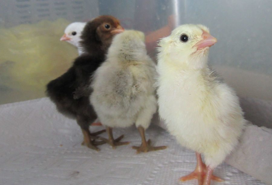First 2 choc orps with a white silkie (?:egg marked "wbc") in the middle