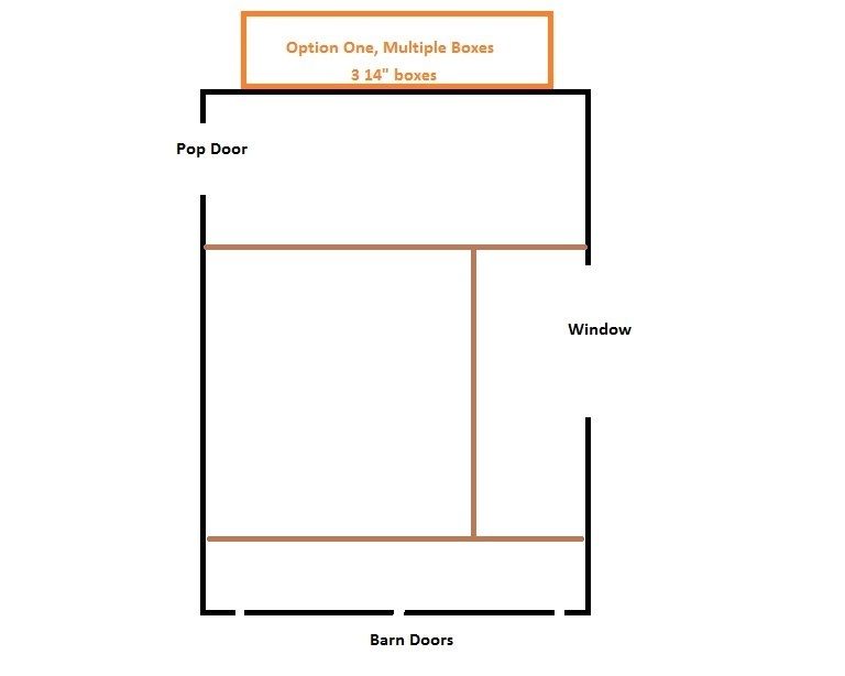 Option Two: If having the nesting boxes near the pop door is a problem (or the runoff just seems like an insurmountable issue), I can add one large box to the far side near the barn doors. I won't have more than 5 hens, so this seems like it might work. I could also move this to directly opposite the pop door, or add a second box opposite the pop door.