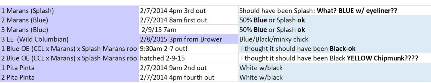 I cannot figure this out! I collected and set all eggs myself. Except for the Pinta Pinta eggs, the daddy should have been my Splash Marans roo. There is a slight chance that my Blue Mille Fleur Bantam Cochin roo fertilized somebody but I moved him two weeks before I started this test hatch, so that should have been out of the girls’ systems! Here is my chart, with who the egg came from, and when it hatched out. Highlighted in blue are what I thought would come & what has come out. The other two are what I thought was coming out.