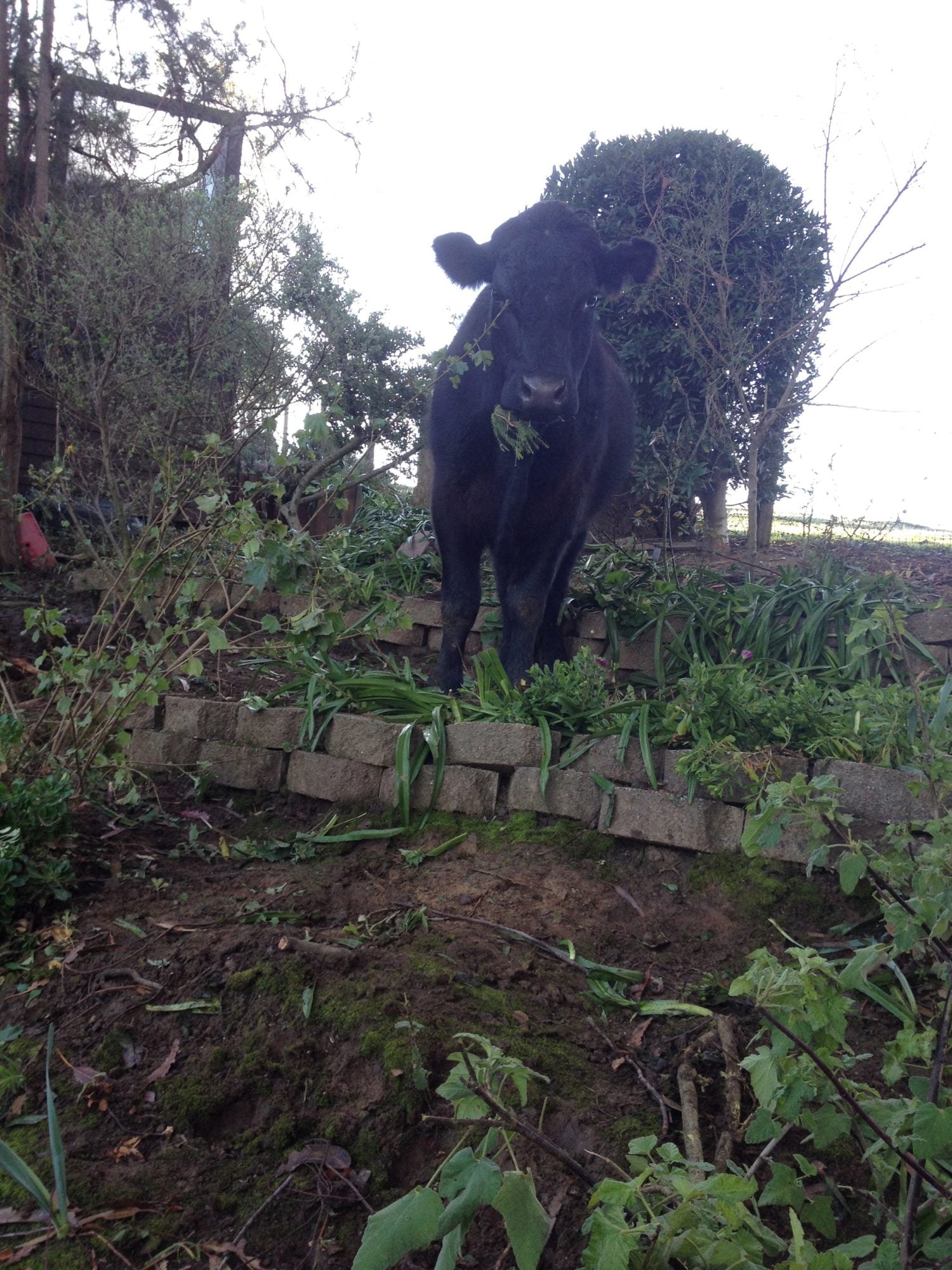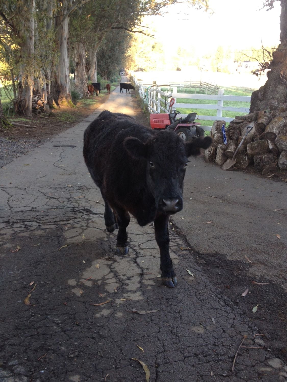 Our neighbors cows jumped the fence a couple of weeks ago. We called the owner's home and cell numbers and no answer so we left him a message telling him that we had some of his cows. The cows were tearing up our garden so we decided to herd them into one of our empty pastures. Three days later, we ran into he owner at a coffee shop and told him we had 6/9 of his cows. He informed us that he never checks his messages and apologized. We told him, no problem we are enjoying having them and asked if we could keep them a little longer to mow down the grass. We have now had them for 3 weeks and have not only been impressed by their grass mowing abilities but in the amount of water they drink. Six 1000lb steer drink a full bathtub of water every day. Filling the tub is hard to because they insist on drinking out of the hose. They are soo cute and have certainly been fun additions to the farm.