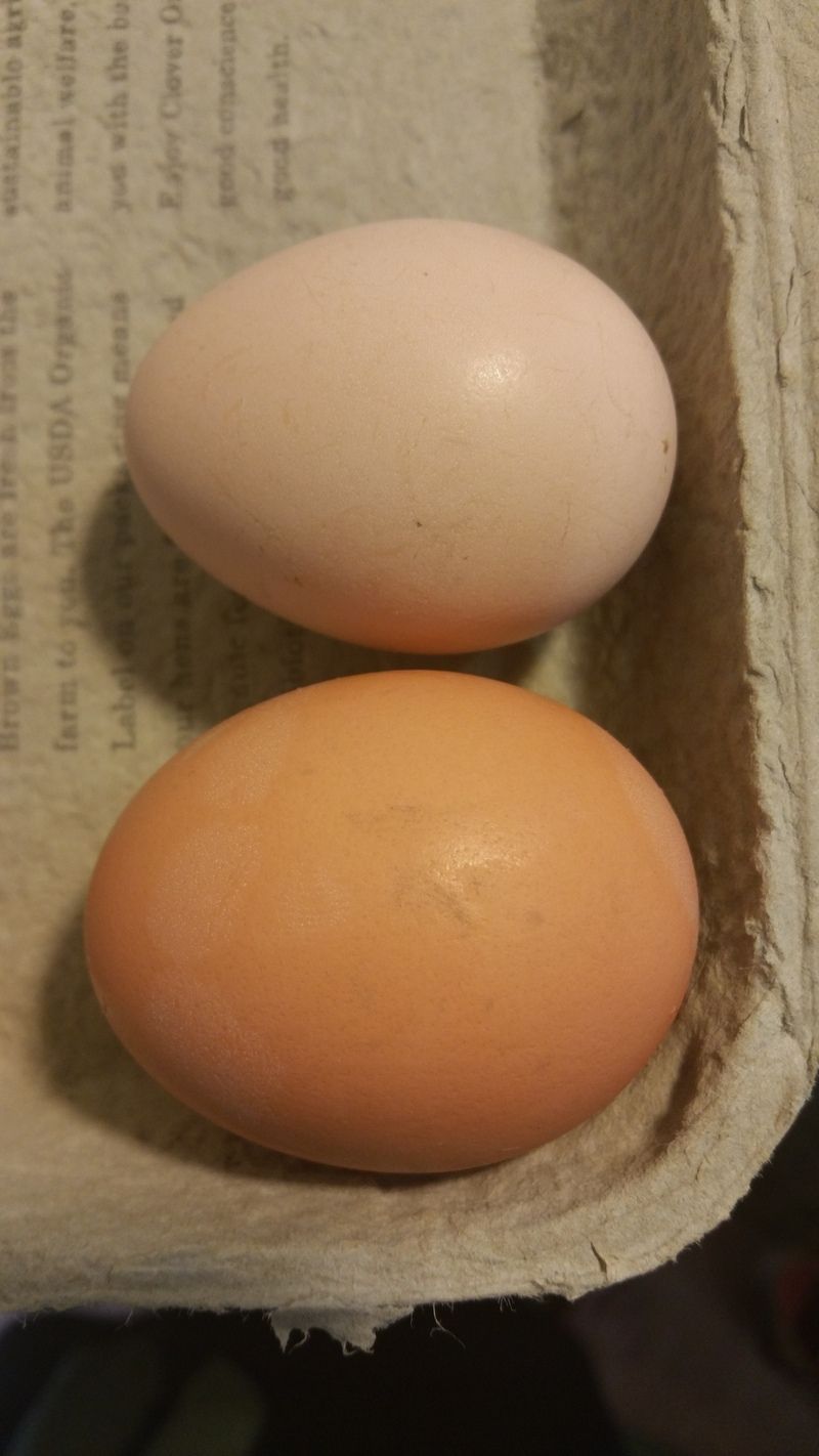Pullet egg (top paler one) compared to an Eatwell Farm Egg (Australorp flock).