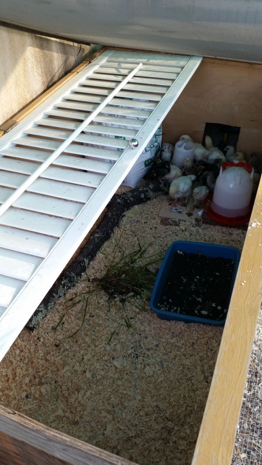 Food, water, dust bathing area, log for jumping on...voila! Chick brooder! Door cut in "bottom end" to make a bigger yard in a few weeks!