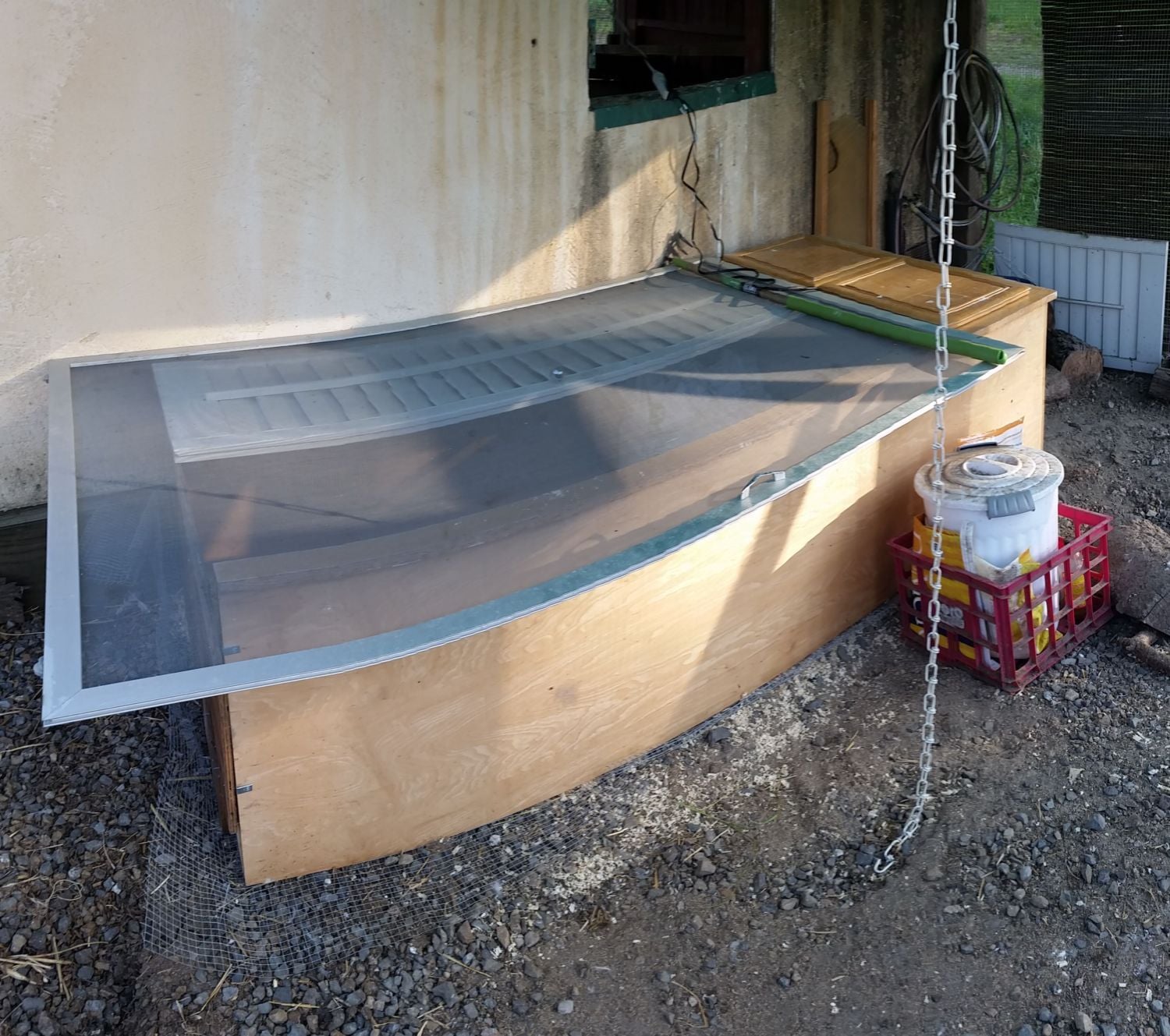 Cabinet placed on leftover hardware cloth, Plantation shutter affixed on one side (to open or shut for more air or less)
