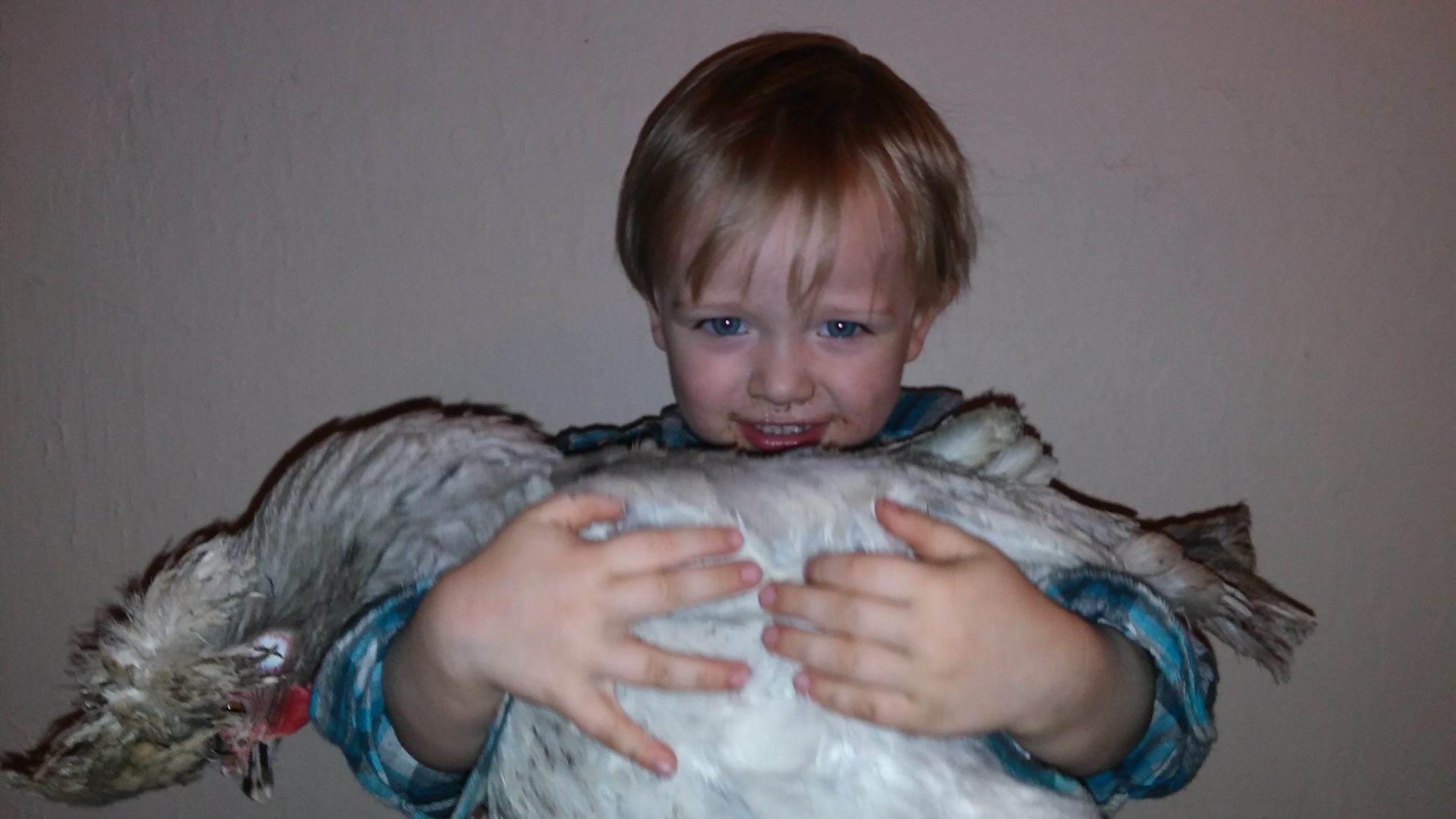 My son was very concerned about them being out in the rain. I normally don't let him around roosters, but once in a while I will let him hold this one while I am right next to him. He is fearless and wants me to let all my roosters free range while he is out with the flock, but he is low enough to the ground to get spurred in the face and I am a paranoid mom.