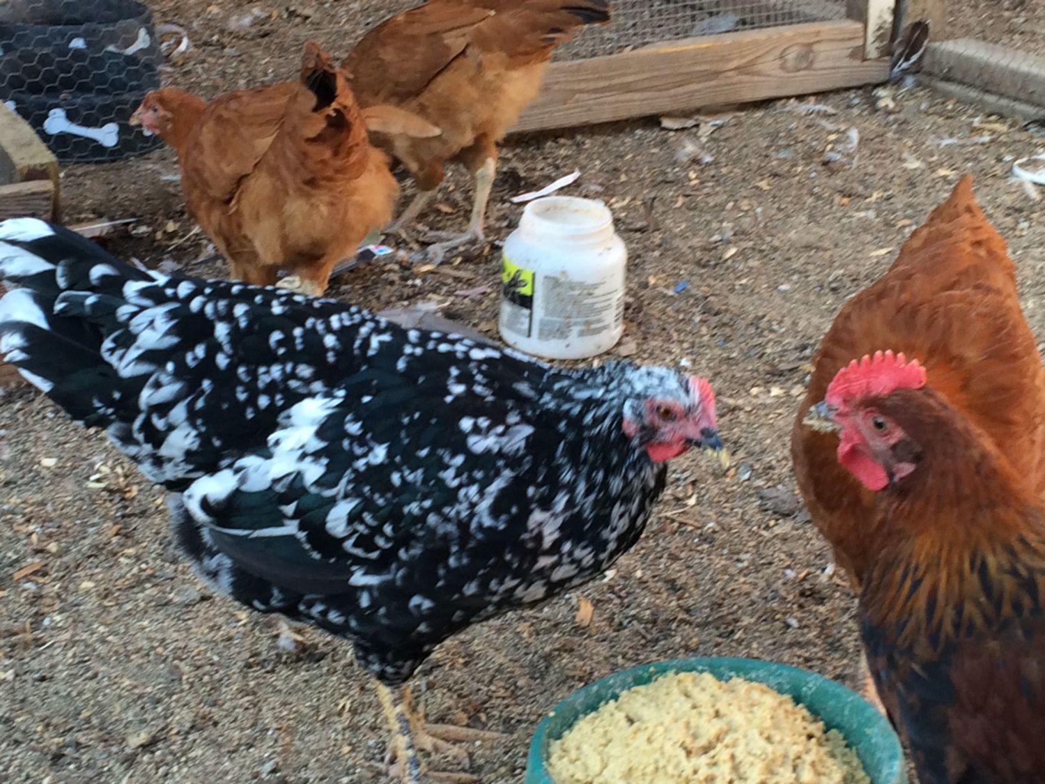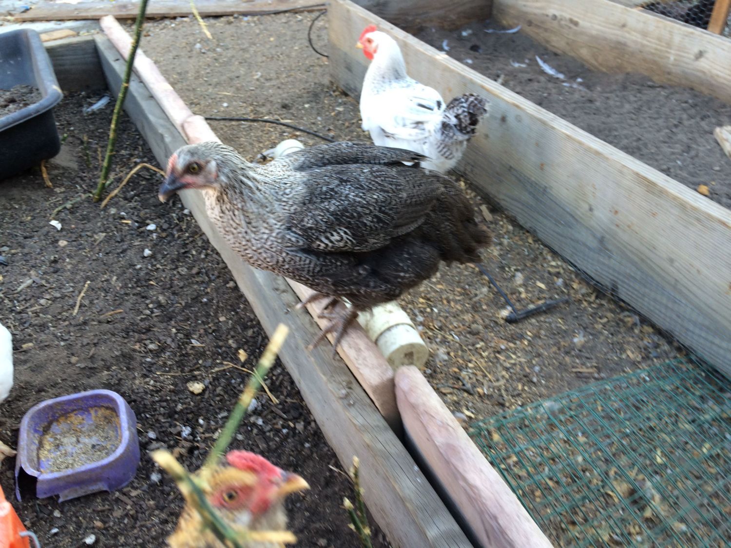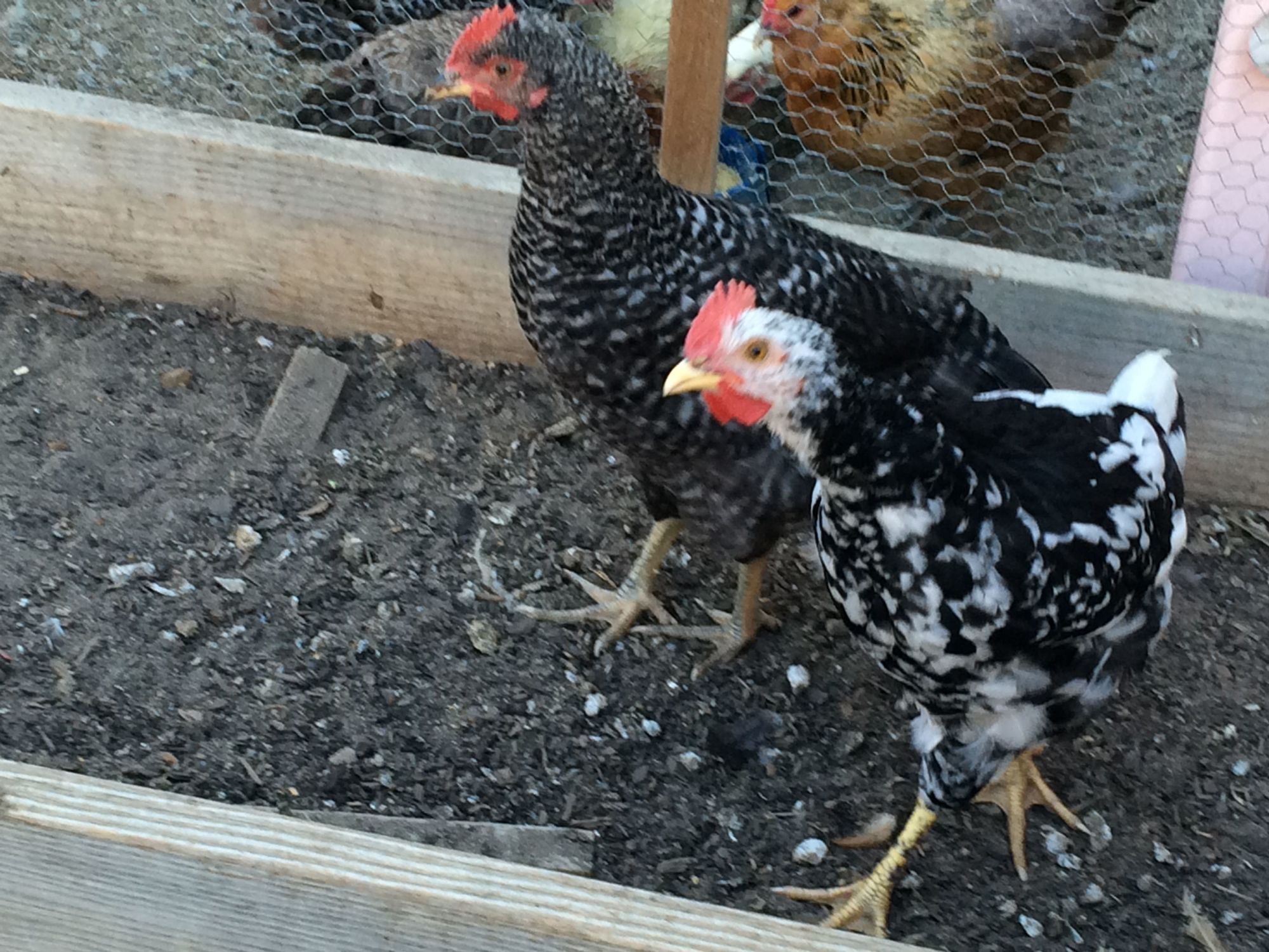 This is my near 20 week Pita girl She looks very good. The Wellie boy is sticking his head in (he was a feedstore pullet) the hamps are getting big too (almost 12 weeks here)