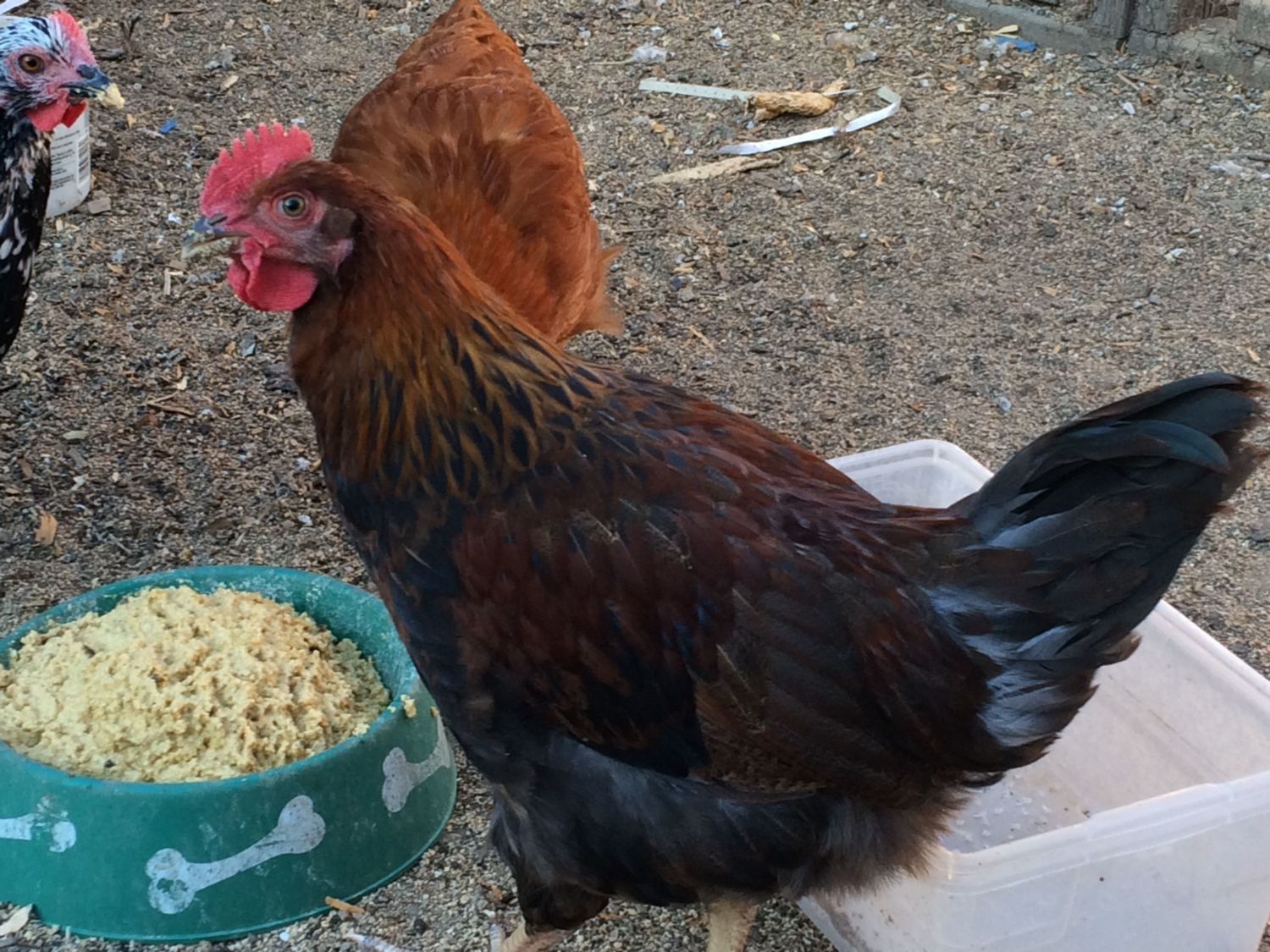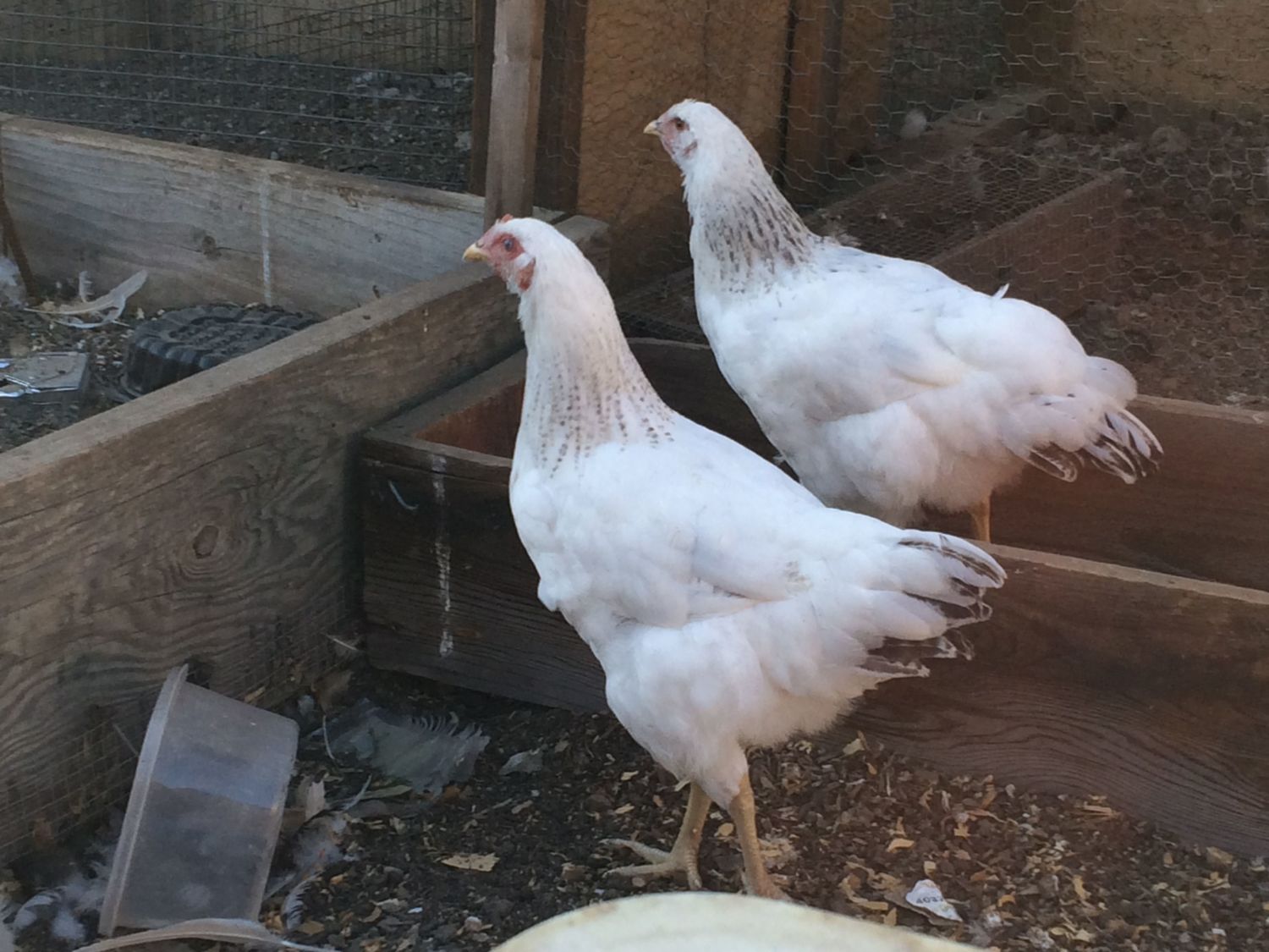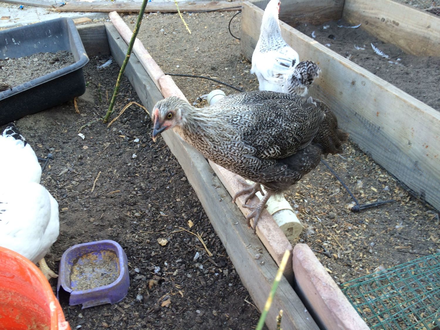 This is my near 20 week Pita girl She looks very good. The Wellie boy is sticking his head in (he was a feedstore pullet) the hamps are getting big too (almost 12 weeks here)