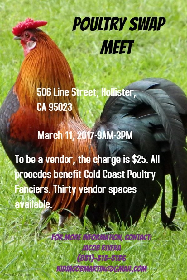 The Gold Coast Poultry Fanciers will be holding a poultry sale/flea market at the Hollister Kmart parking lot on Saturday, March 11, 2017. We're looking for vendors interested in selling livestock (no dogs, cats, or horses), plants, western gear, and general items to benefit the Gold Coast Poultry Fanciers, a nonprofit organization. $25 a vendor space. For more details, reference the flyer or email [email protected].