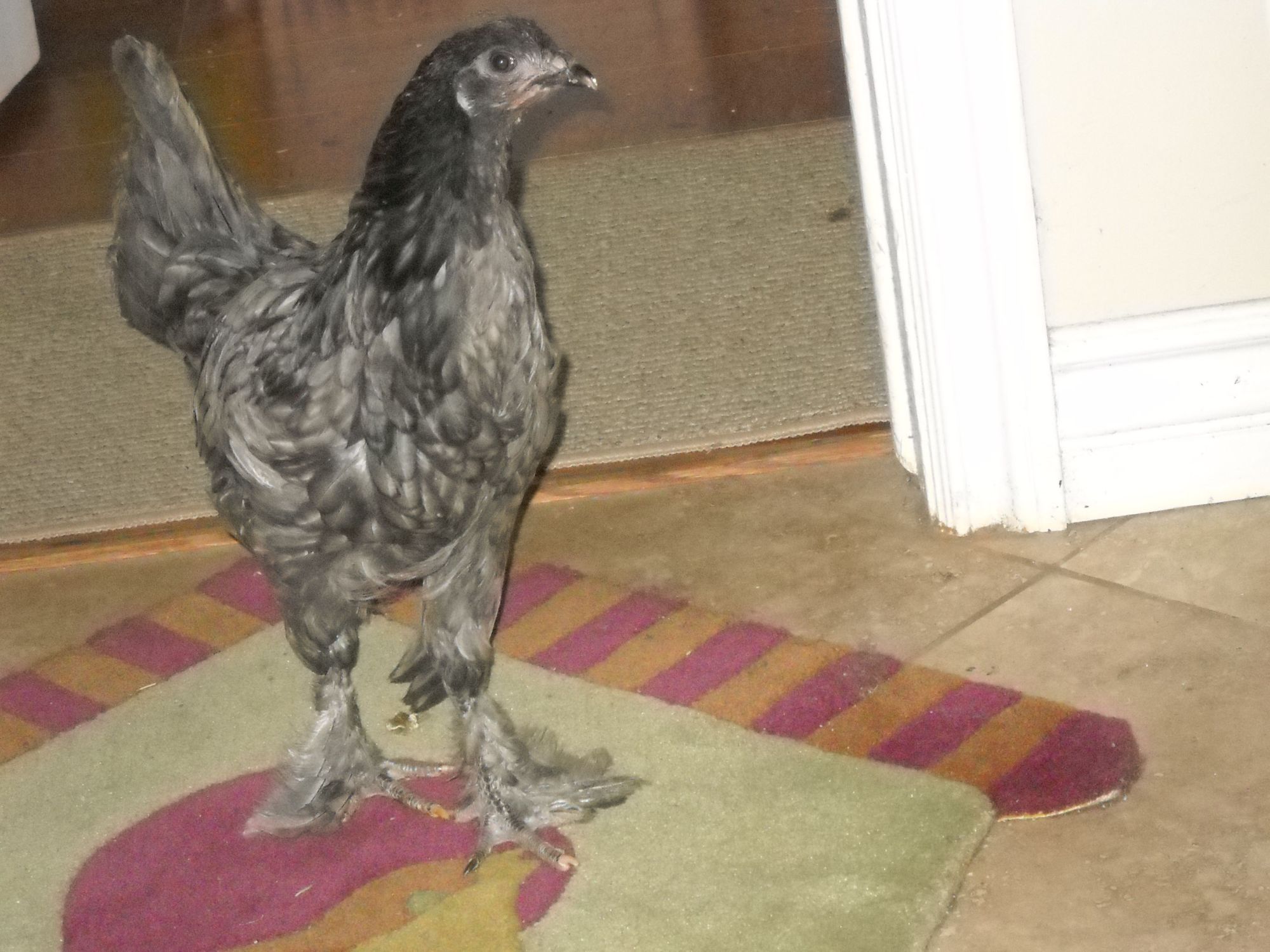 Blue Breda pullet basking in the shade with Silkies shows her long tail feathers.