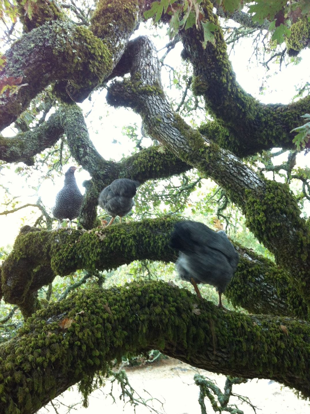 my two SPPRs & the two cuckoo marans decided to go tree-climbing this morning: