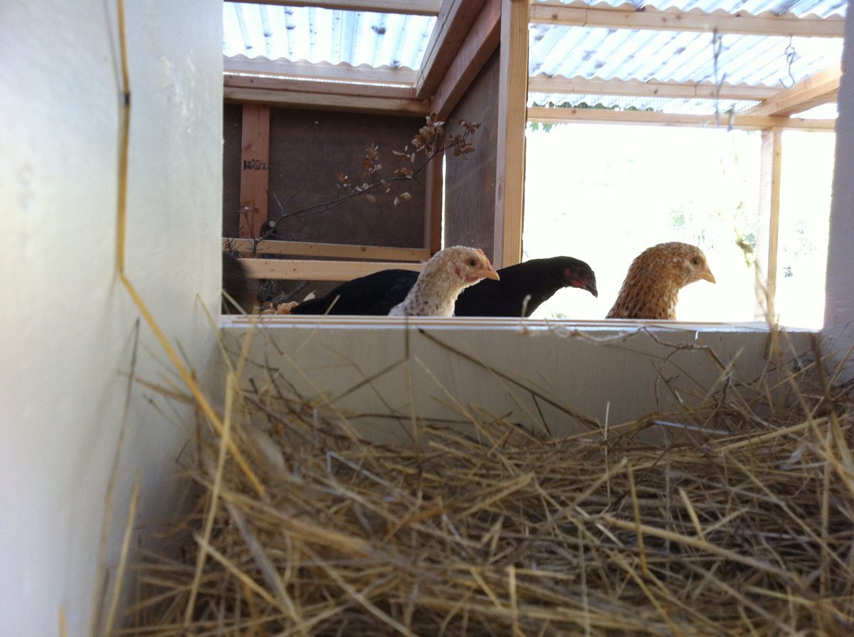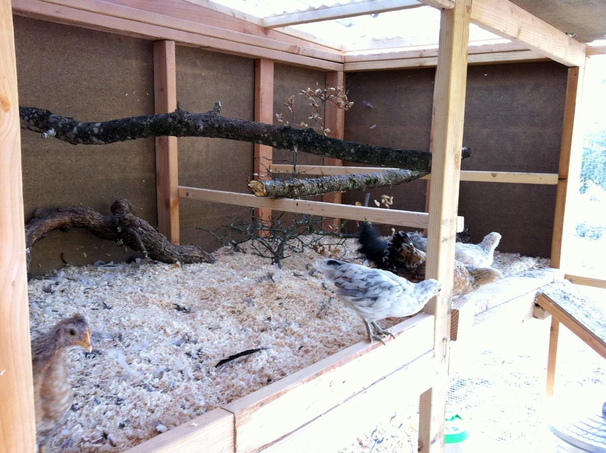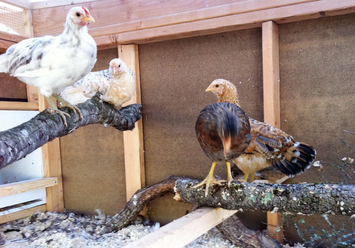 we added two new perches inside the henhouse -- INSTANT approval from the younger flock! (and notice, the two boys next two each other again -- isbar right, Baby to his right on that same perch)