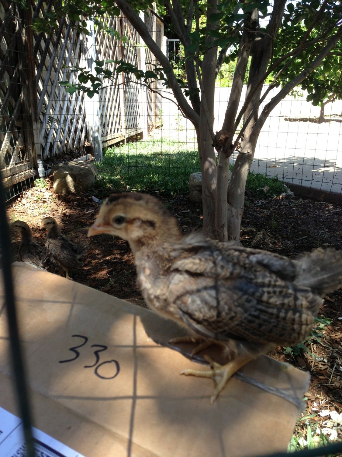 Picked up the new peeps on Saturday... Affectionately called "Thing 1", "Thing 2", and the "Other One" for now. Thing 1 and Thing 2 look exactly alike, but Thing 1 has the outgoing, flighty, feisty personality where Thing 2 is more laid back. (The things have beginnings of tiny crests.) The Other One is a sweetheart and has a smooth head so far. Here they are in the play yard (fencing is to keep the dogs away - supervised at all times.)