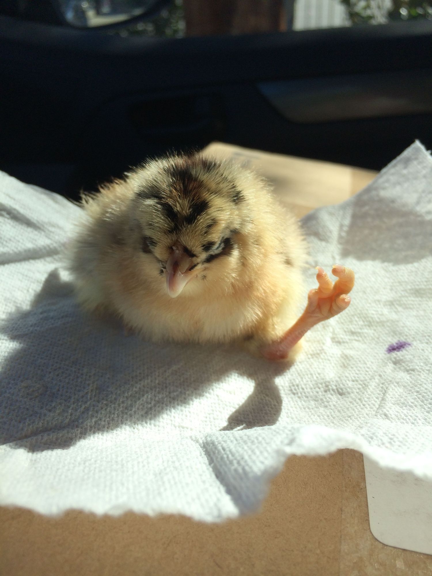 Yes i have 3 separate coops per breed and no more than 4 per coop. My Orpington coop is only occupied by 3 girls. So, she may be living inside my house for a while then. She is eating and drinking well, so far, and trying to play, although she is dragging her left leg. I am spinning my head now, seems like when I try to massage her leg and stretch it, she seems ok. Maybe birth defect instead of hatchery injury? She is able to sit straight, and I gave her a teddy bear to lean on.