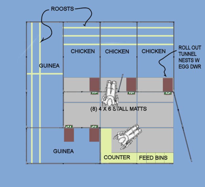 I plan on two full walls one on the Counter top side of the house and one on ther roost side of the house. There will be a pitched roof this time. Each chicken partition will be 6 x 6 x 12. The guinea partition will be 6 x 6 x 30 including that little ell where the nests are. Yeah Yeah LIke I am dreaming about getting guineas to lay their eggs in nests...