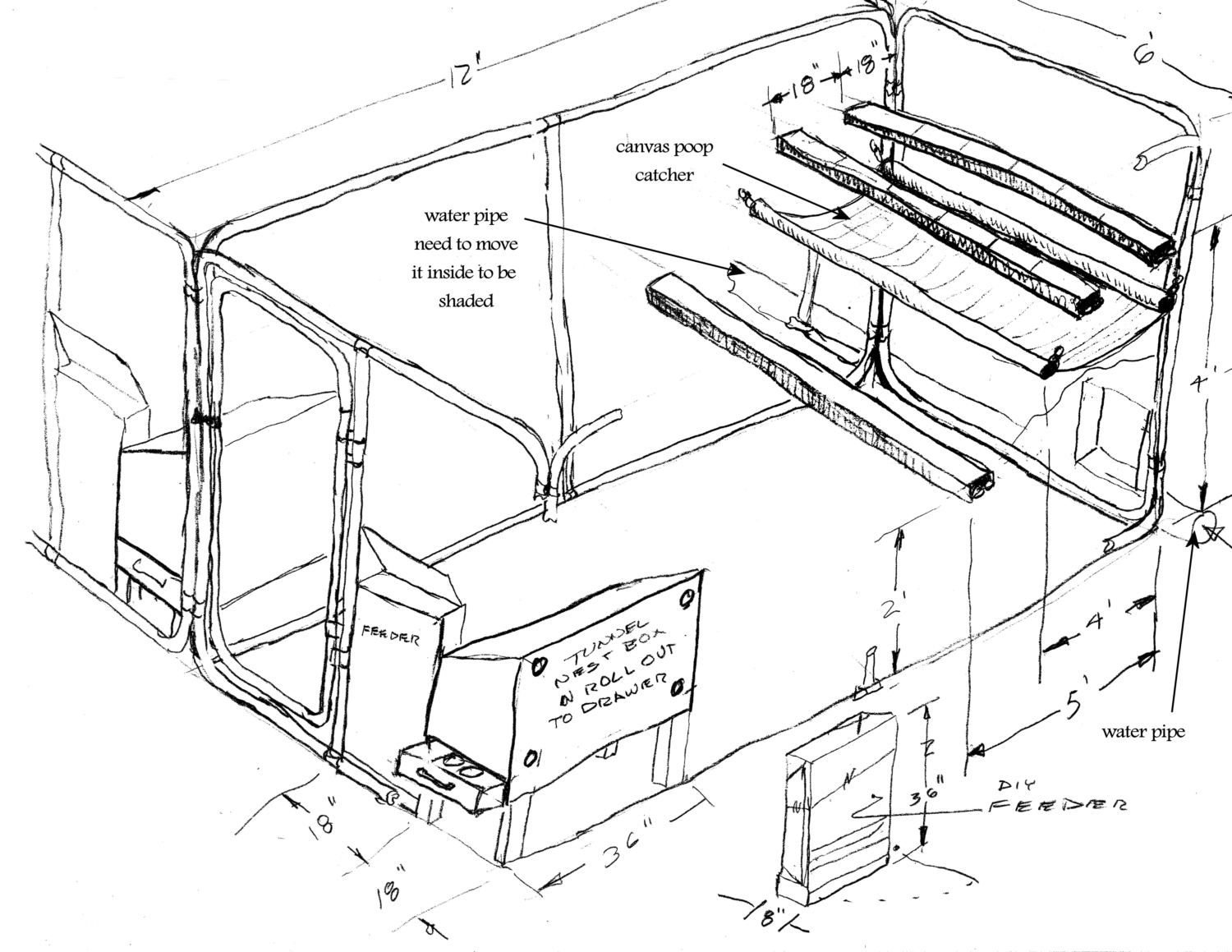 I wanted us all to be able to walk inside without stooping or banging our heads, and I have a roost bar on one end at about 6.5 feet high that the birds LOVE to hang out on.