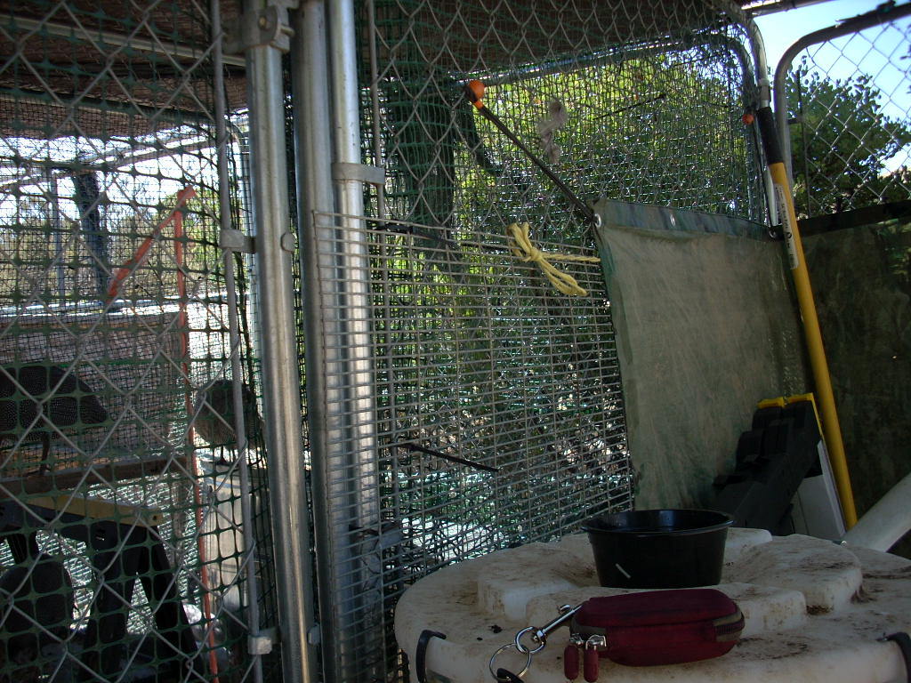 The top is completely covered with 1/2" hardware wire/cloth and half-covered with a roof of plywood with tar paper. I tarp the whole top during winter with a waterproof tarp from Do It Center. My yard is visited by bobcats, raccoons, coyotes, and an occasional mountain lion so I need the birds to be safe at night.