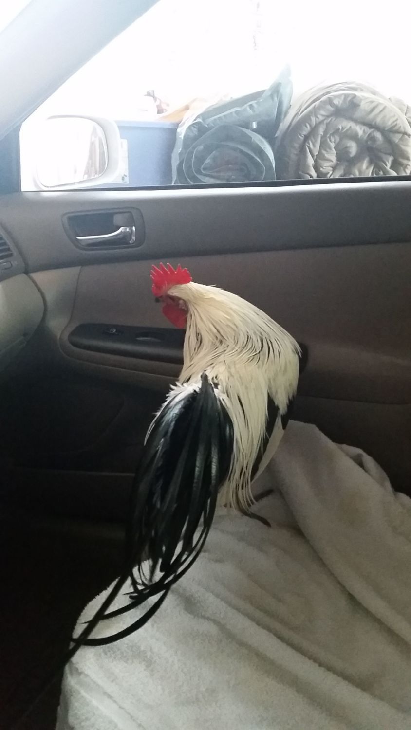 My Special Needs rooster got a field trip to the feed store yesterday since he couldn't be with the other birds who were all stuck in their coop. He was NOT happy being a human companion all day. This morning he was SO HAPPY he ran like a tiny, puffed up turkey all the way to the others in their coop and went chest first into Nero, The Big Roster, but he didn't care, he was SO HAPPY!