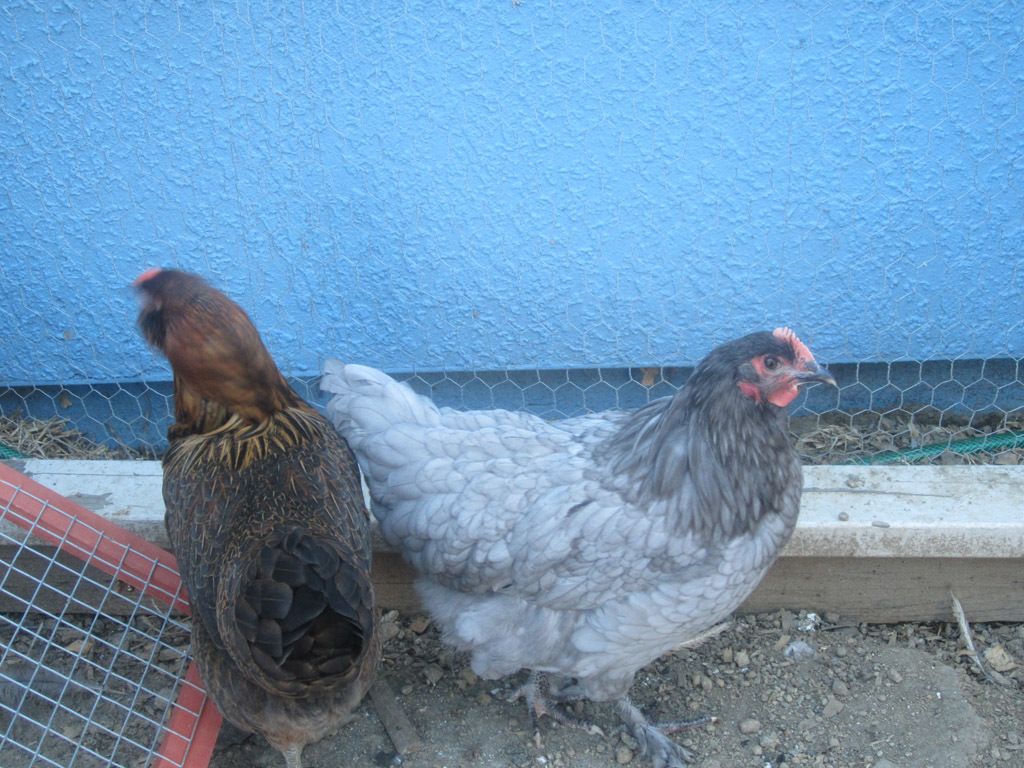 Chipmunk and Mananda. Maranda is a Marans but I don't know her genetics. She has feathers on her feet and is blue. She does not have any copper bleeding. I don't know if she is a true blue or if she comes from Cuckoo marans stock