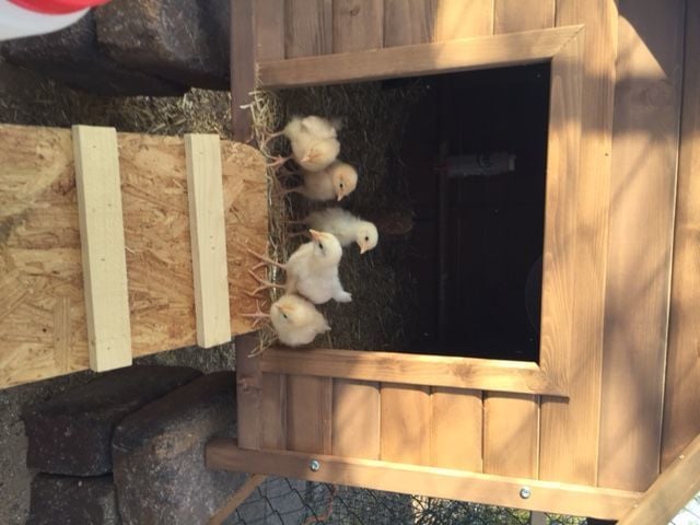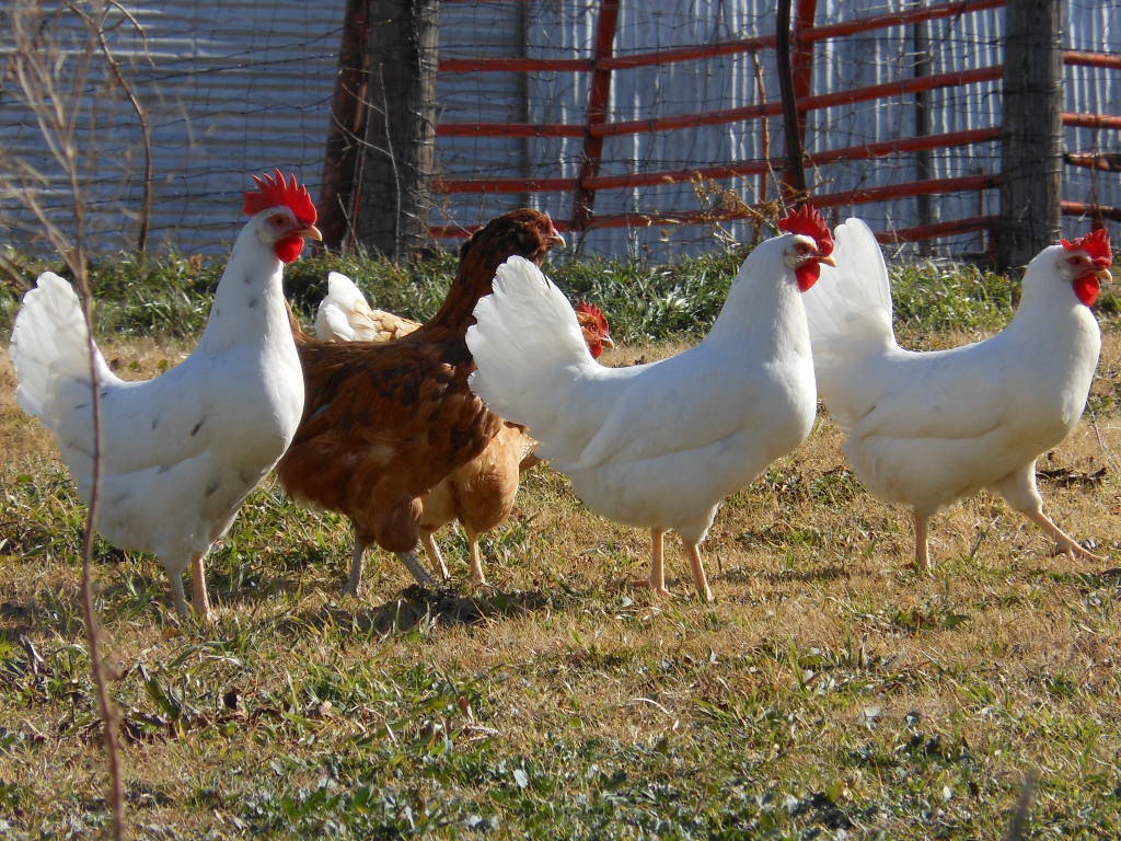 The pullet in the middle and the one on the left are both California White pullets. They are from a hatchery and as you may notice the one in the middle doesn't have very much black on her feathers. She does have a few black spots on her left side which isn't visible in this photo. The one on the left is very pretty and lays a huge white egg! Both Cal Whites and the White Leghorn are skittish and flighty, but they all come when I call them and all of my girls follow me around like puppies![]()