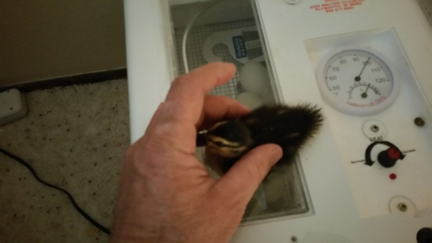 Here's my secret weapon this year, 2 runt ducklings that hatched 6 days ago, making them peep to encourage the ones still in the eggs. I talk to the eggs a lot to encourage them too.