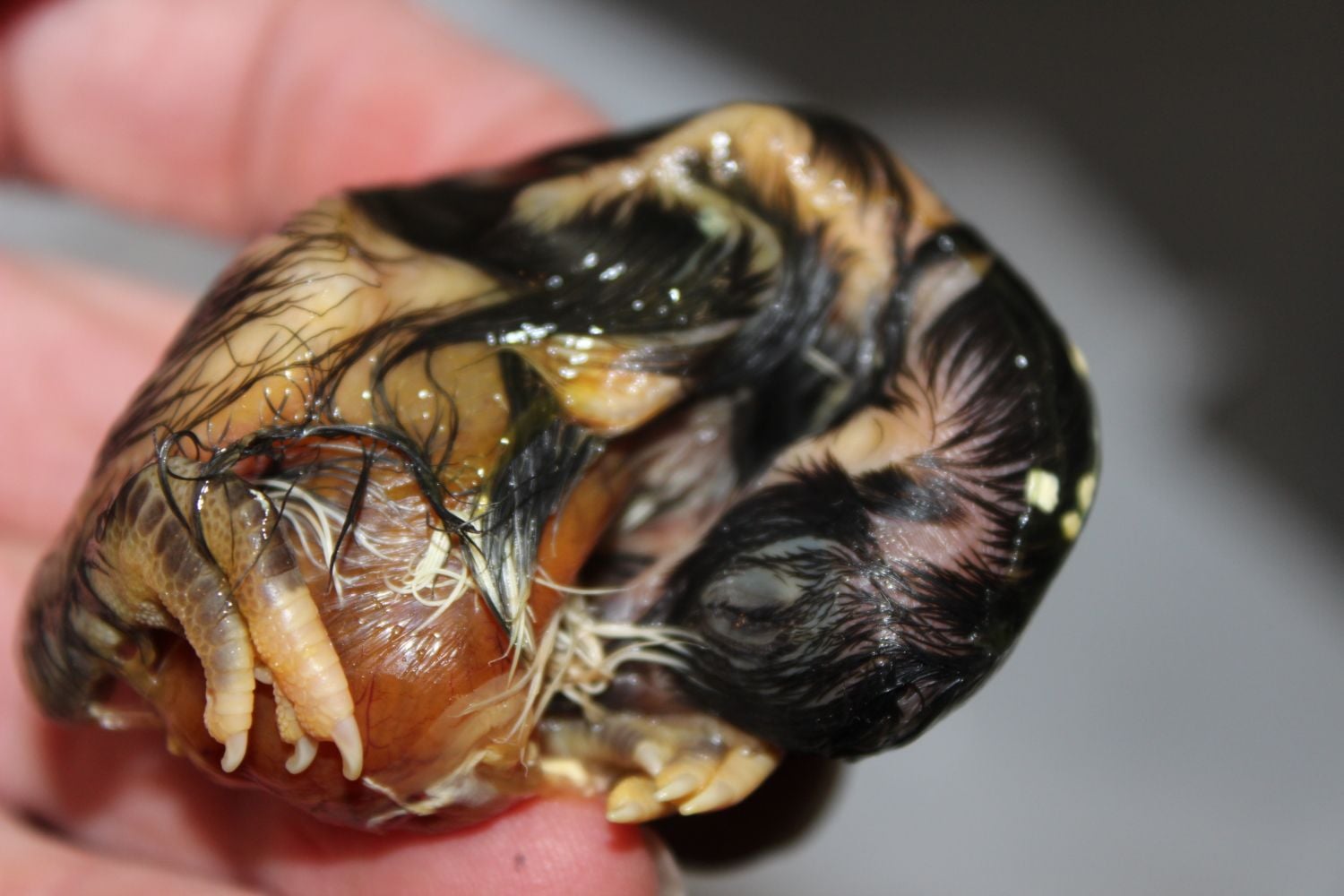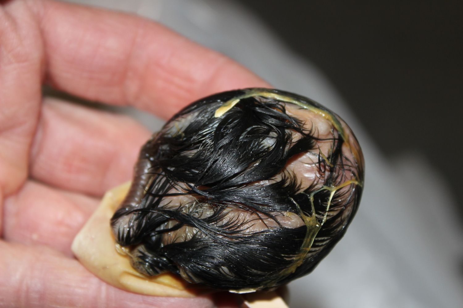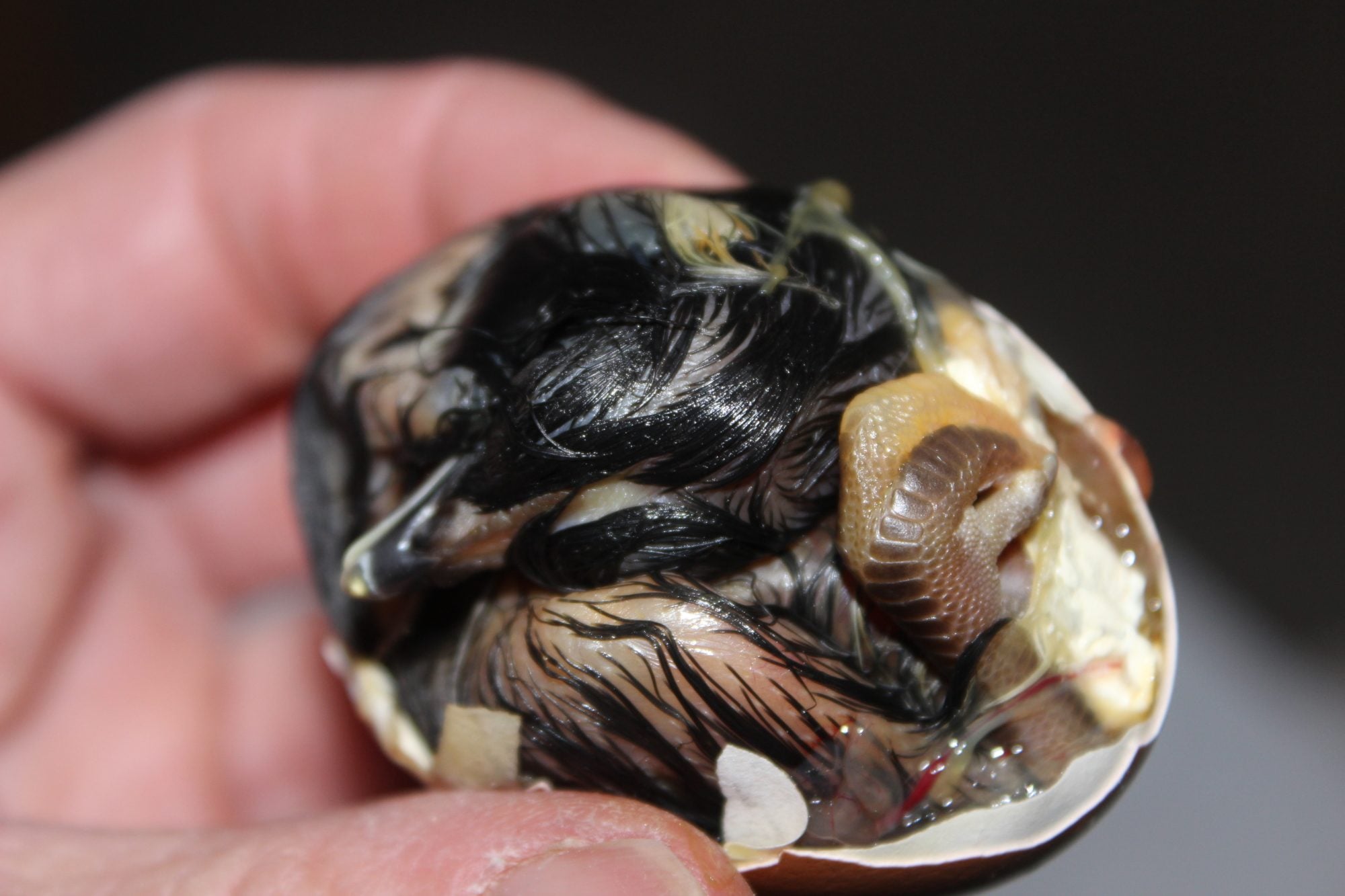 2/21 fully formed chick, no external or internal pip, air space not in correct place (maybe split air space?) Egg shell very full of chick. No room for drawdown. Head untucked but beak not near air space(s). Air space seemed to be near pointy end and also on an upper side, but not a very large air space in either place.