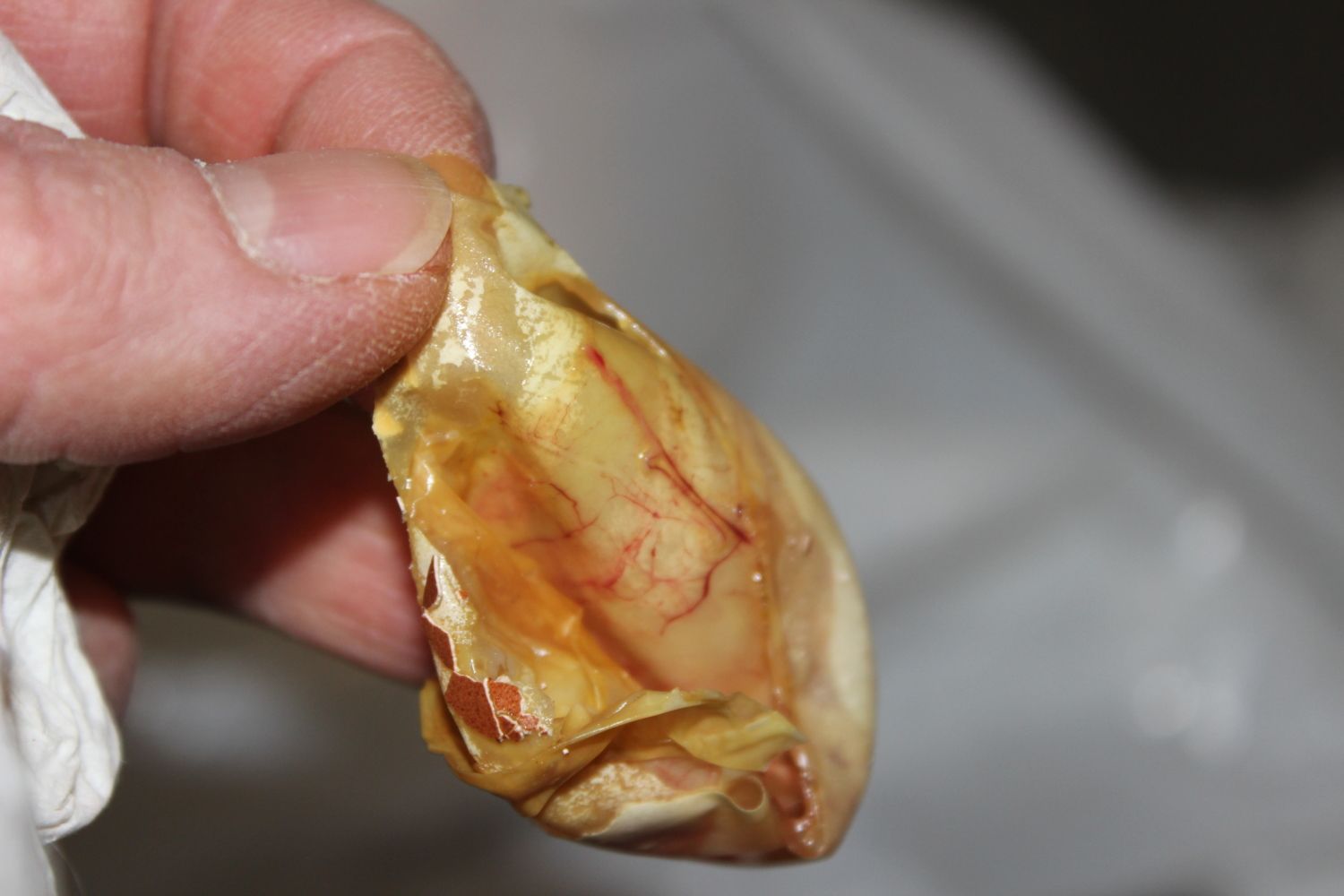2/24 fully formed chick, no external pip, yes internal pip into air space, some gelatinous stuff & veining