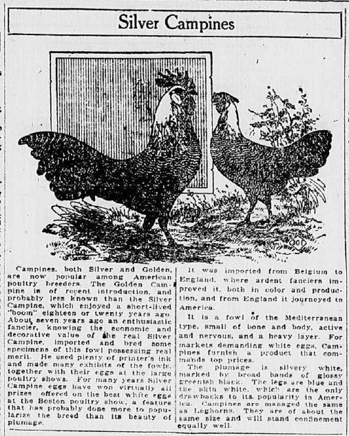 I doubt there are 12 decent Campines, much less STANDARD Campines, for sale by a single source anywhere in the US. I have a total of thirty Campines at this time and only about 12 of those will be considered when I make my final cull down to 8 for breeders. I would not sell any of those birds, unless someone made me an offer I couldn't refuse.