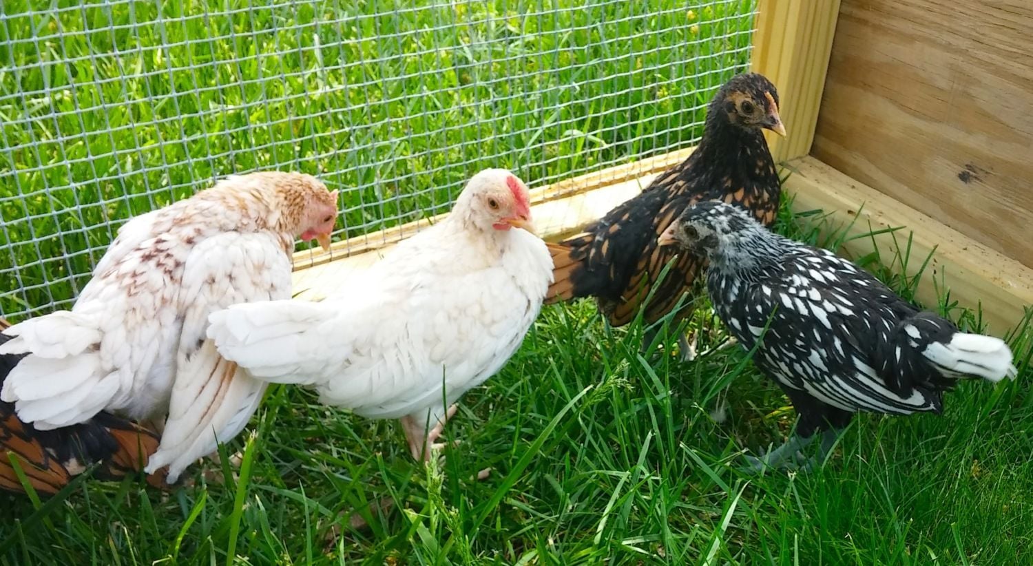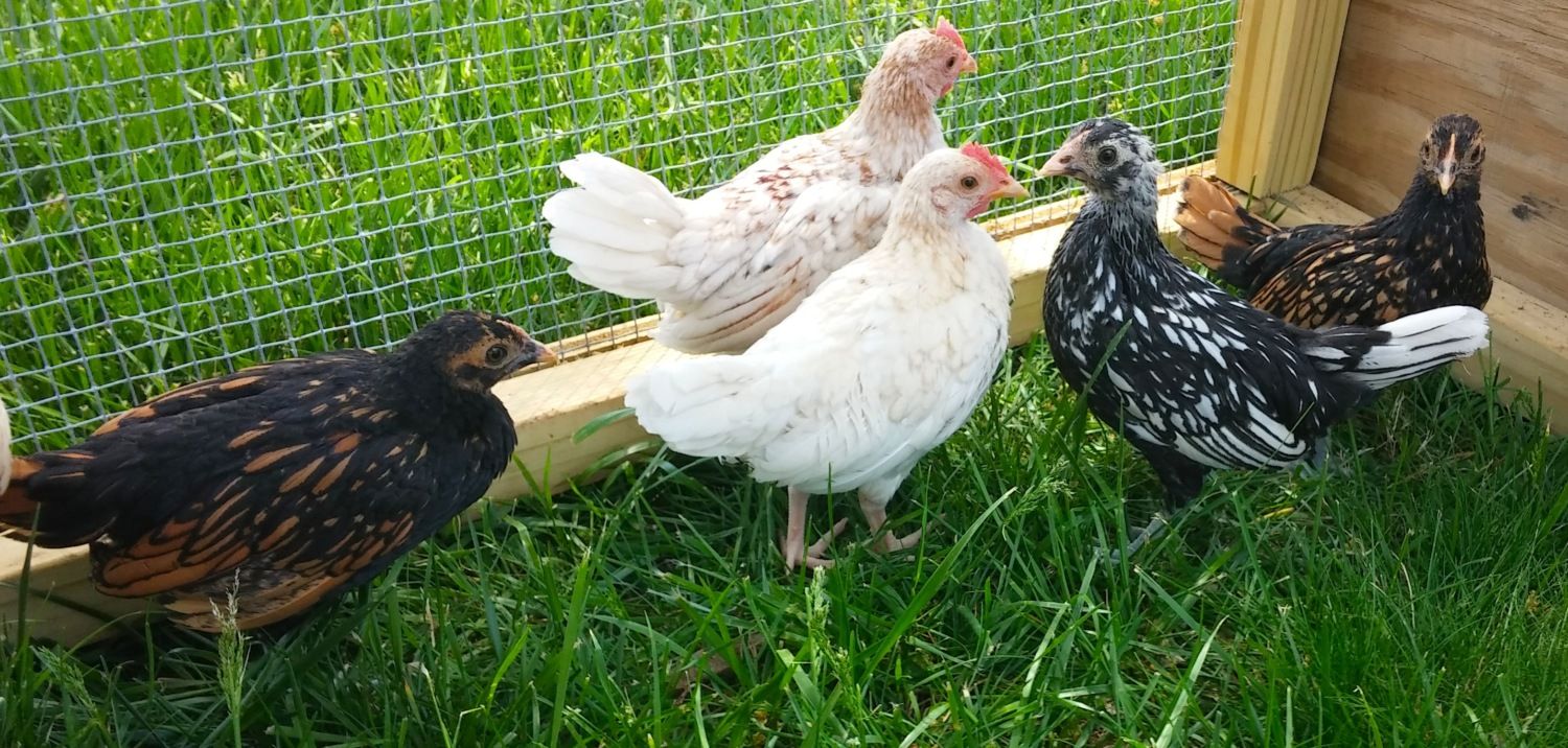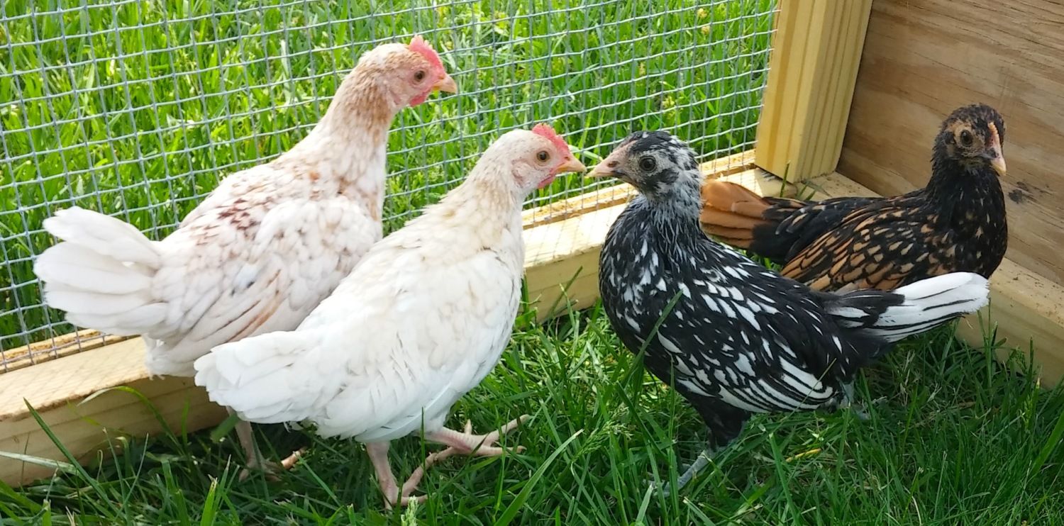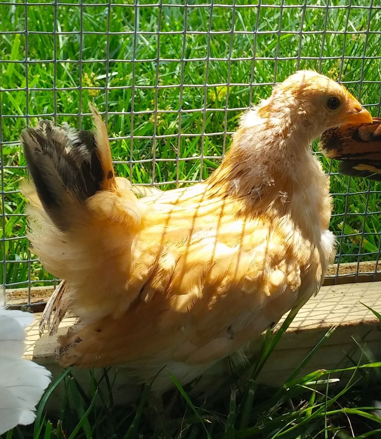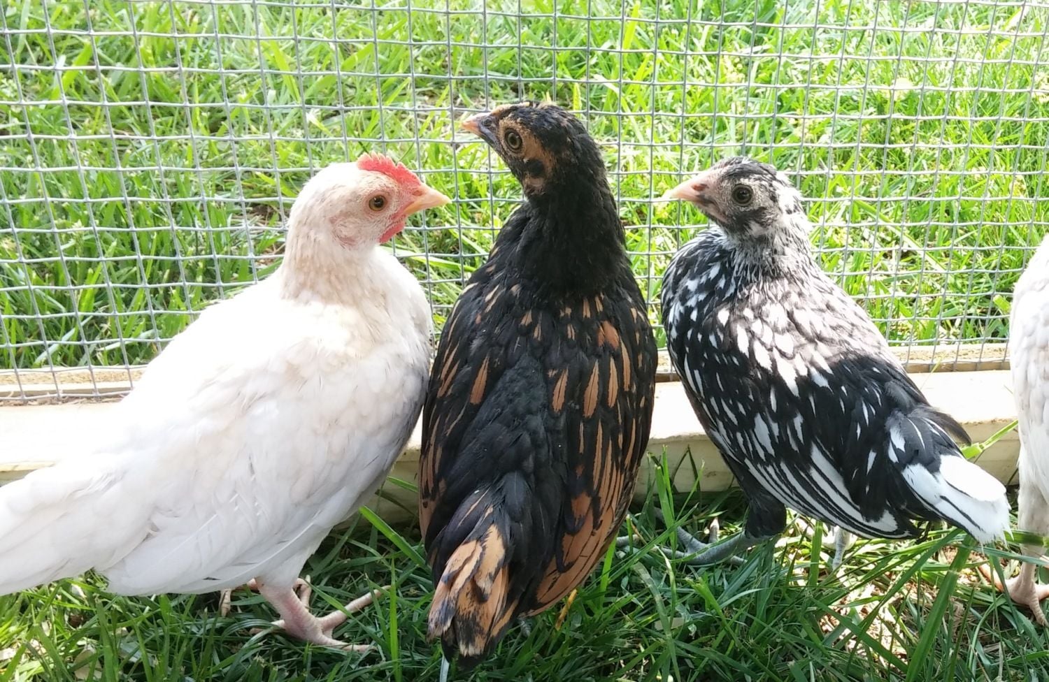*The black and white one also seems to have a flat, wide, smushed comb with a little point (like one of the black/gold ones). It has slate legs. Roo or hen? Breed?