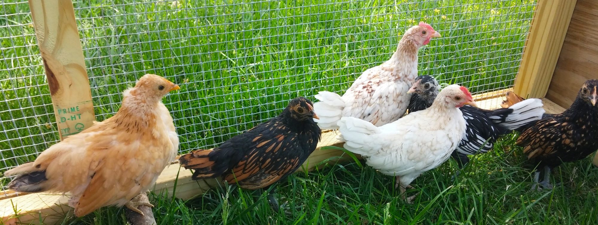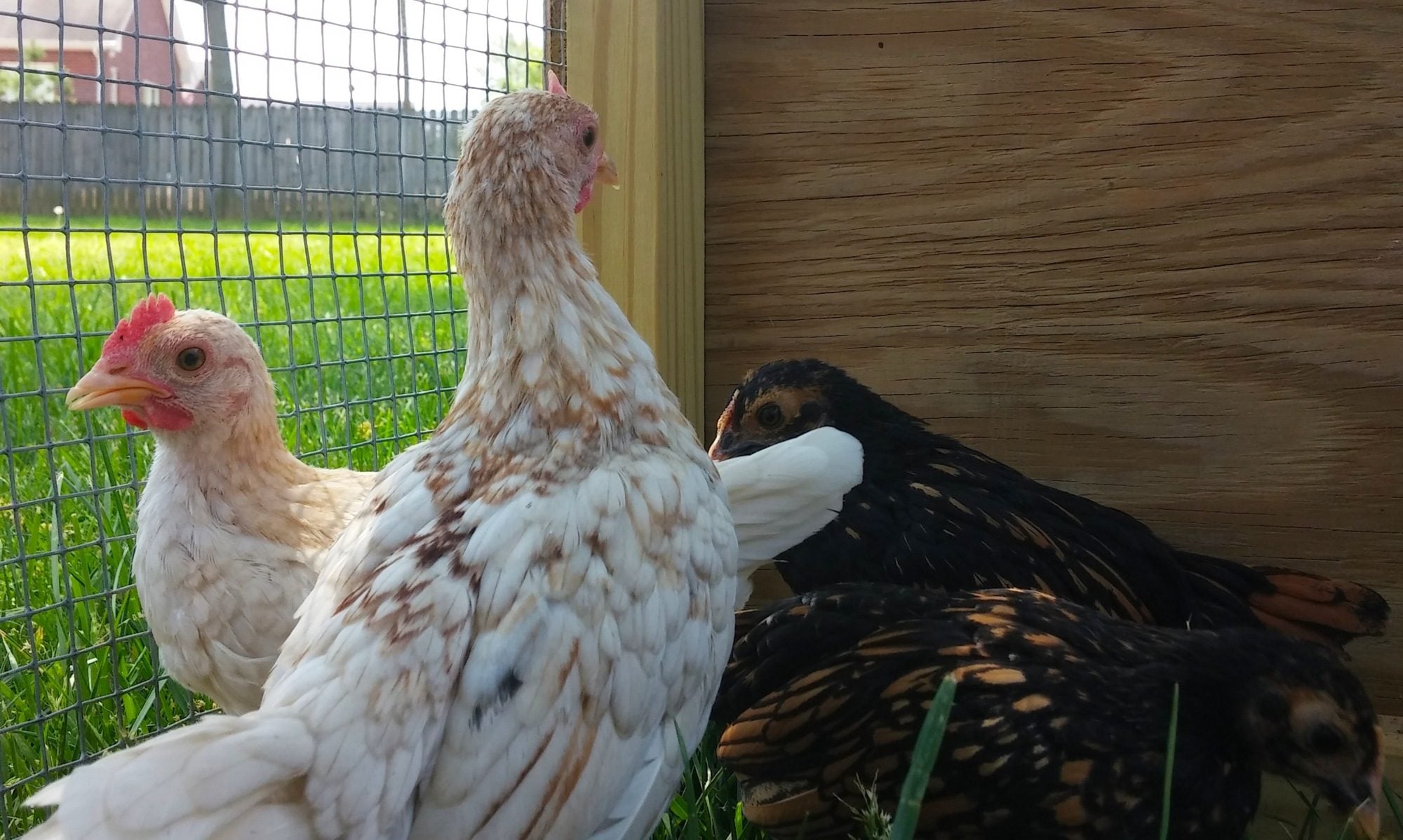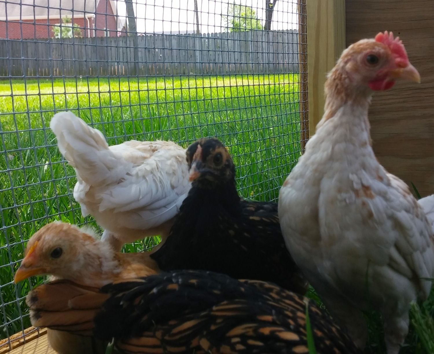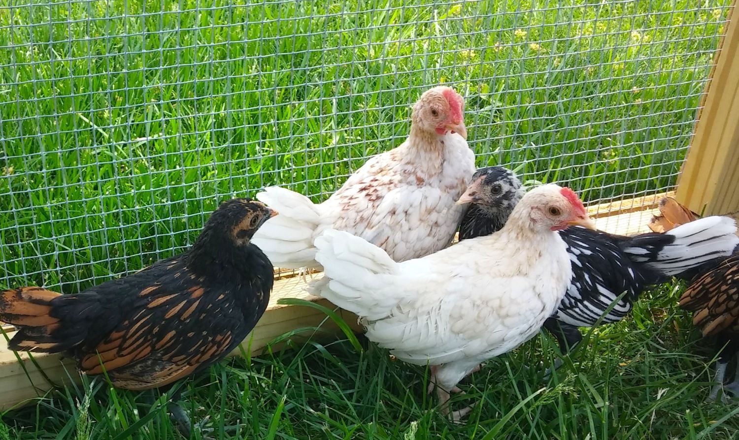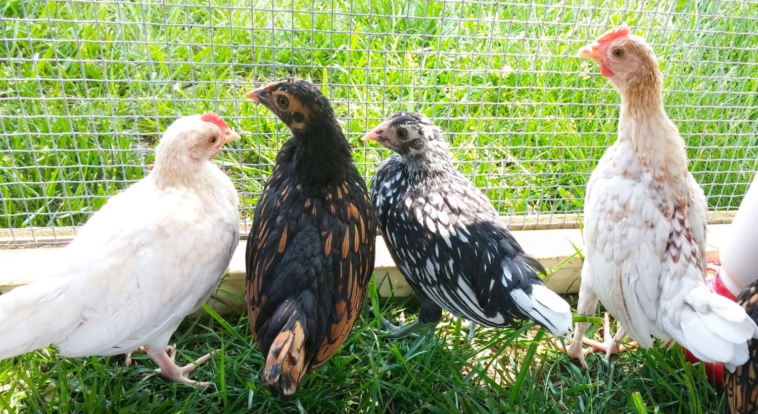 *The black and white one also seems to have a flat, wide, smushed comb with a little point (like one of the black/gold ones). It has slate legs. Roo or hen? Breed?