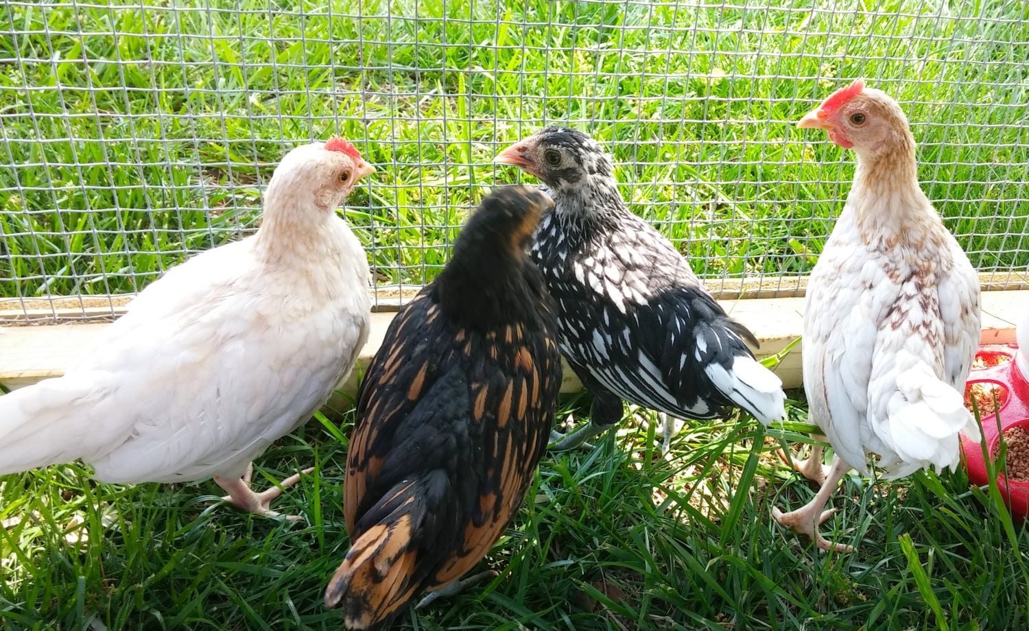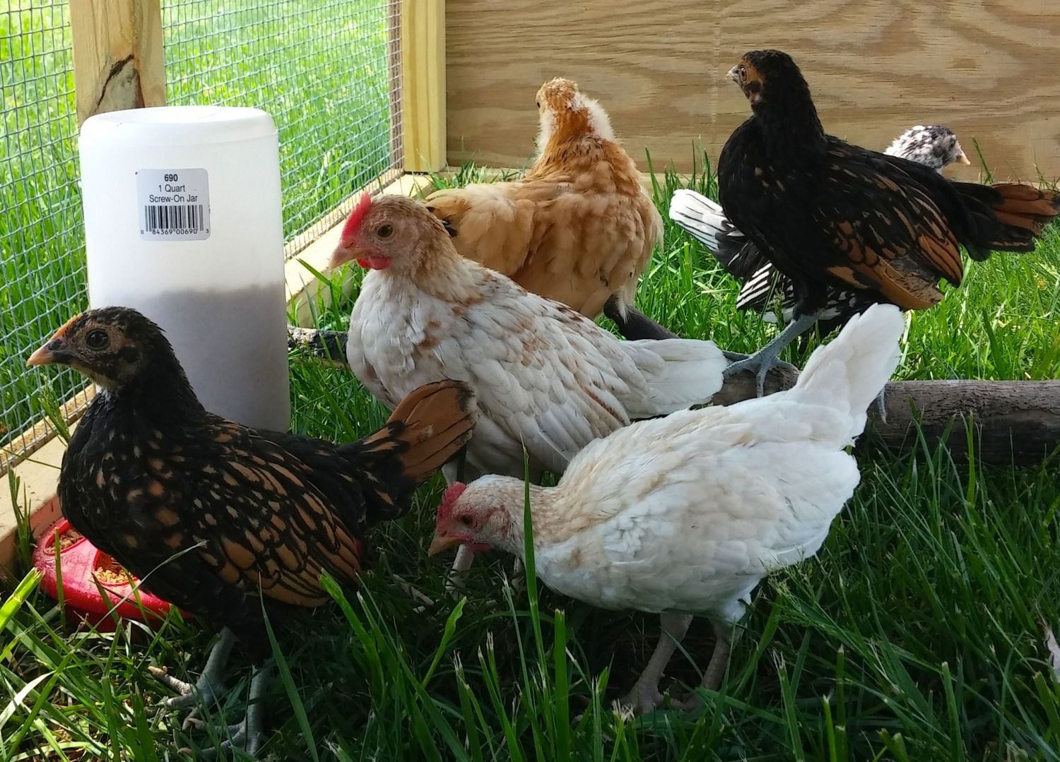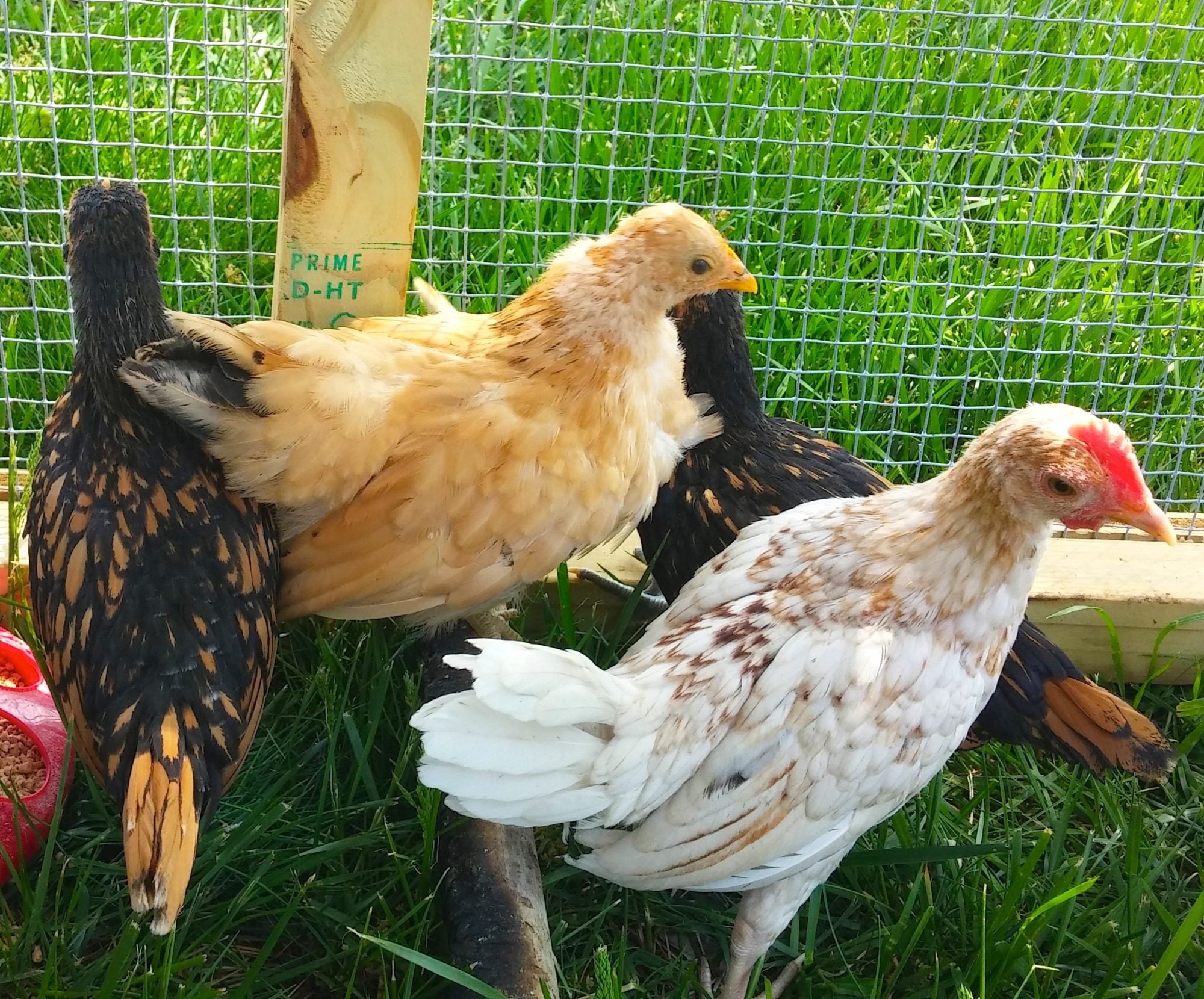 *I think the gold one may be part Japanese Black tail?- it is very short-legged compared to the others, and it's beak is yellow with yellow legs. I'm not sure if it's a roo or hen...?