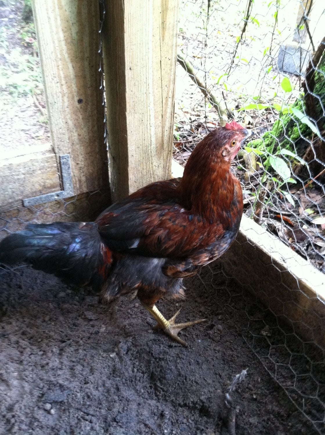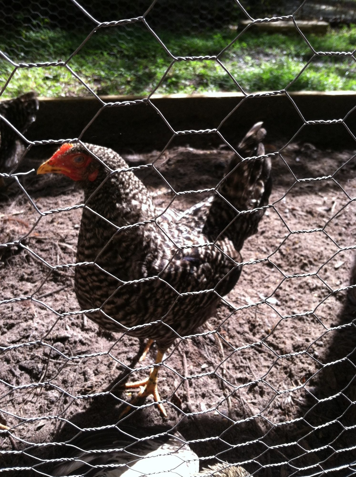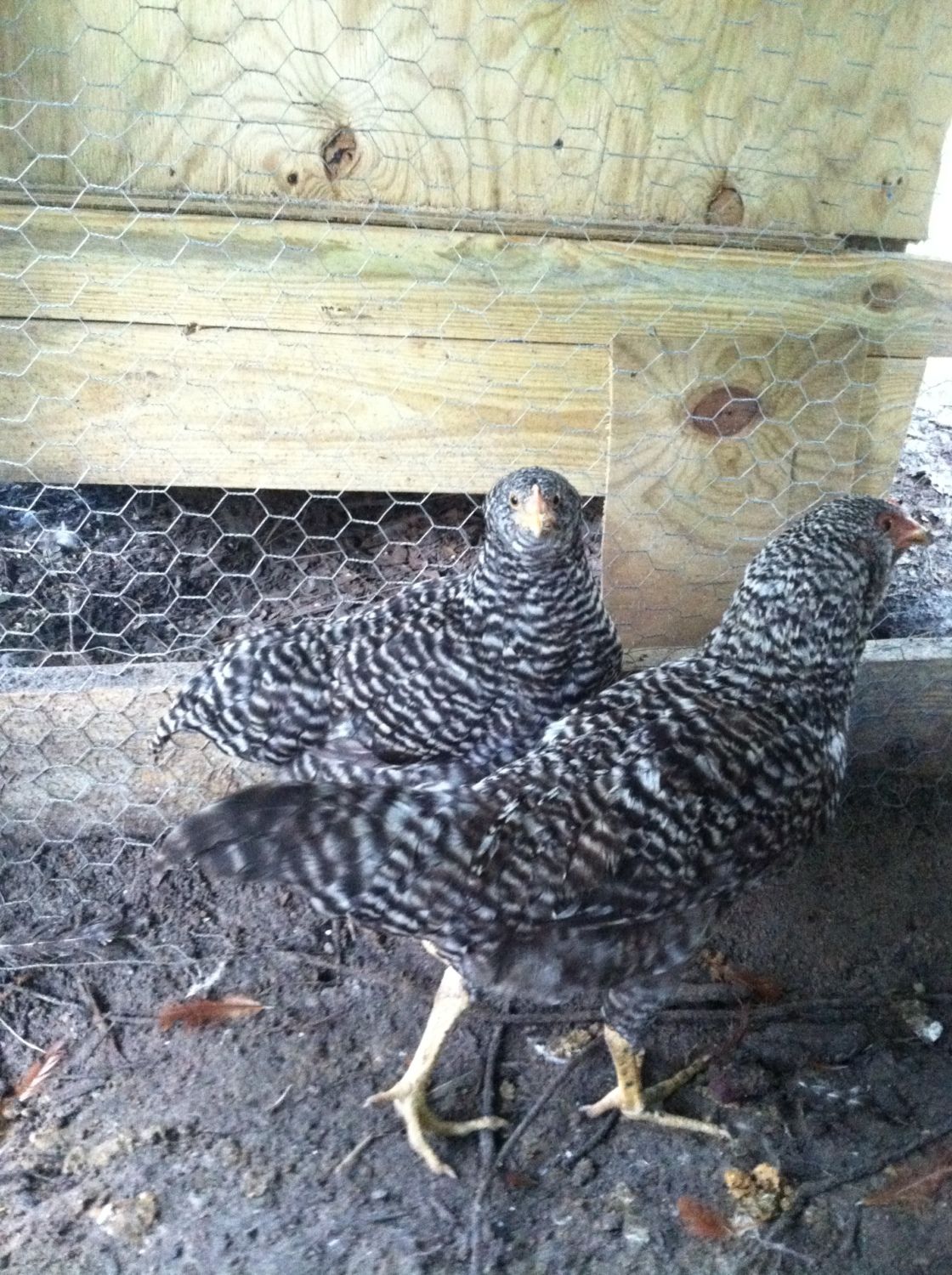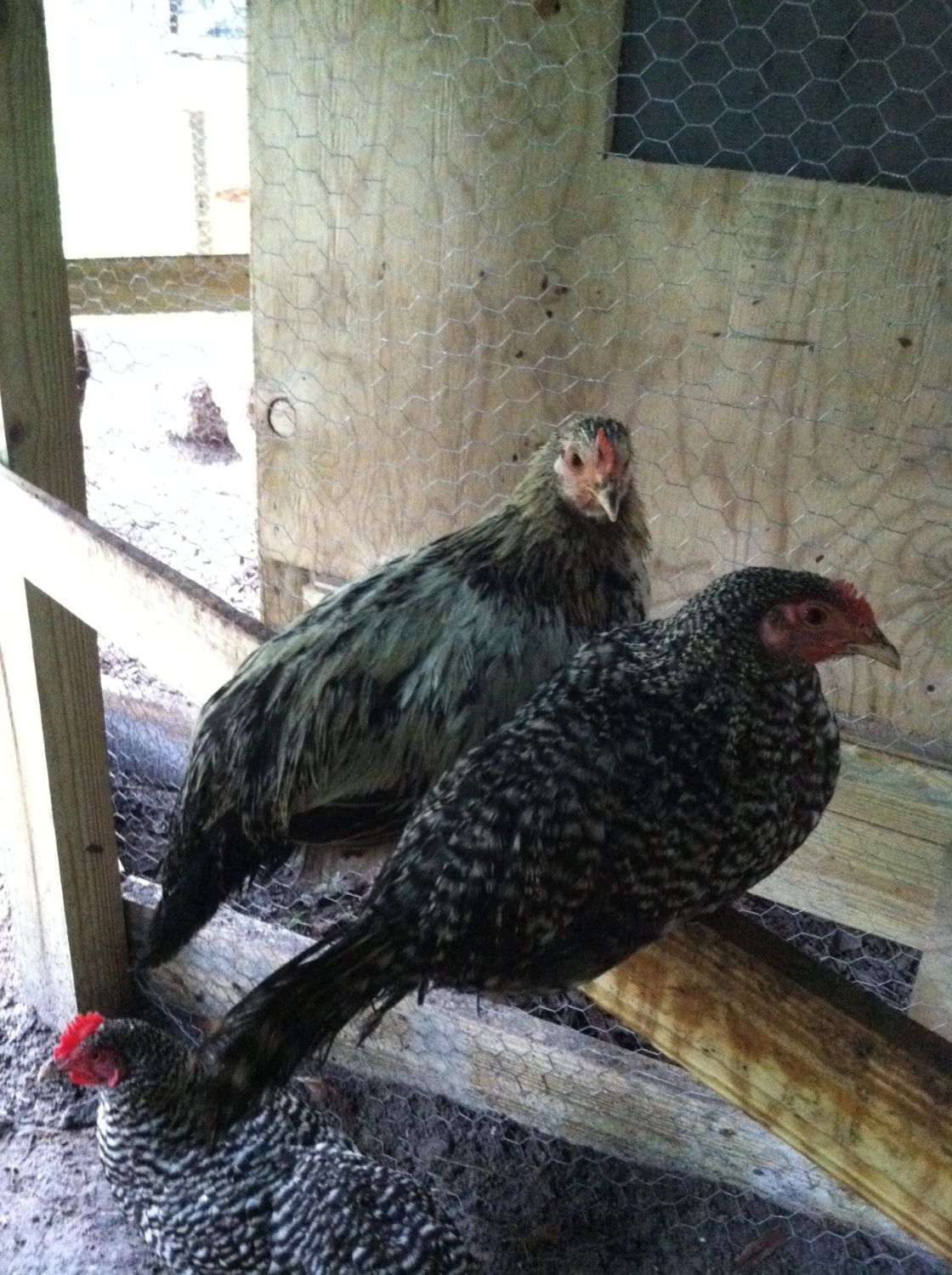 Ameraucana cross roo? up front. BR pullet in the back. Middle one looks like rooster