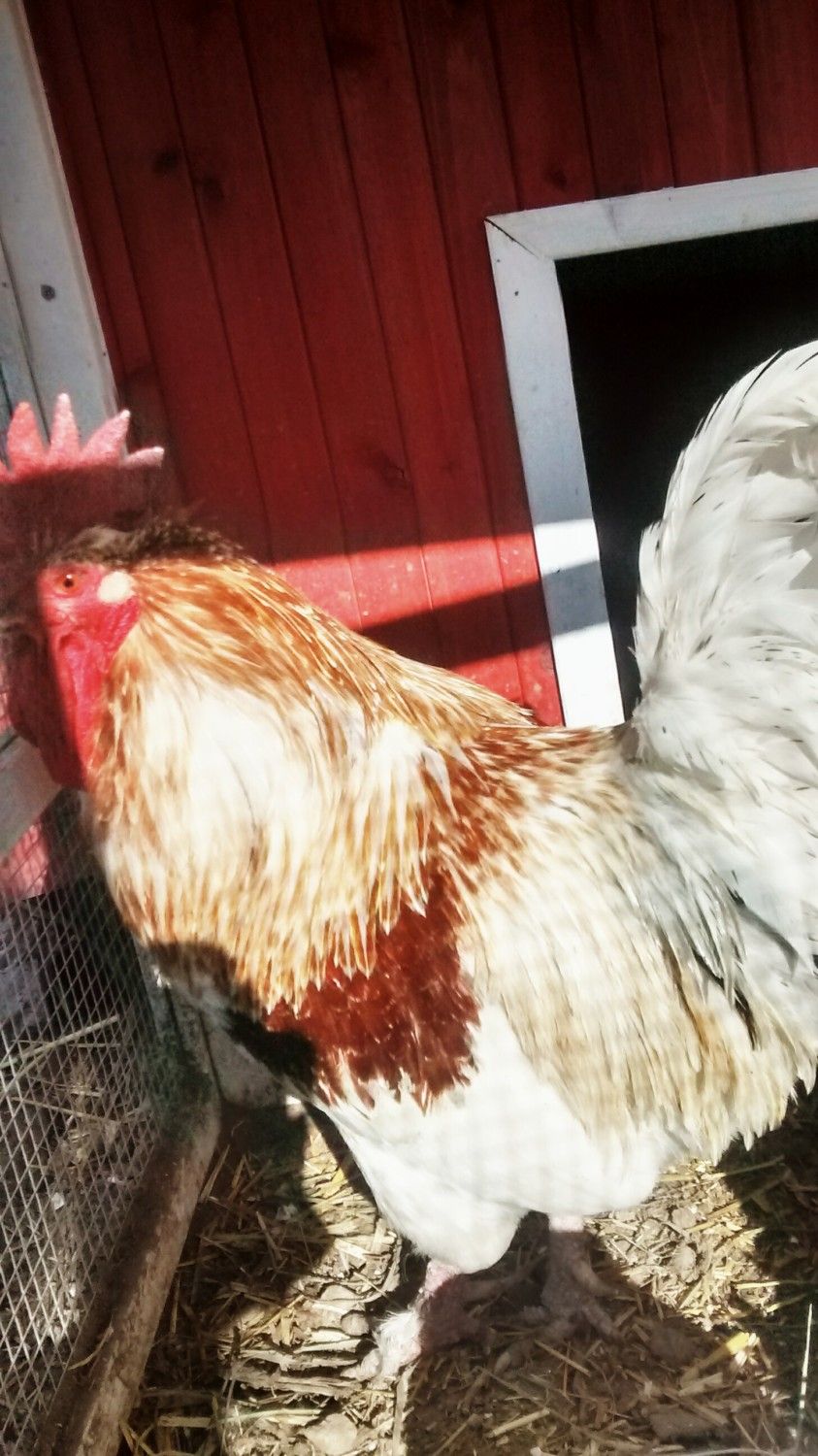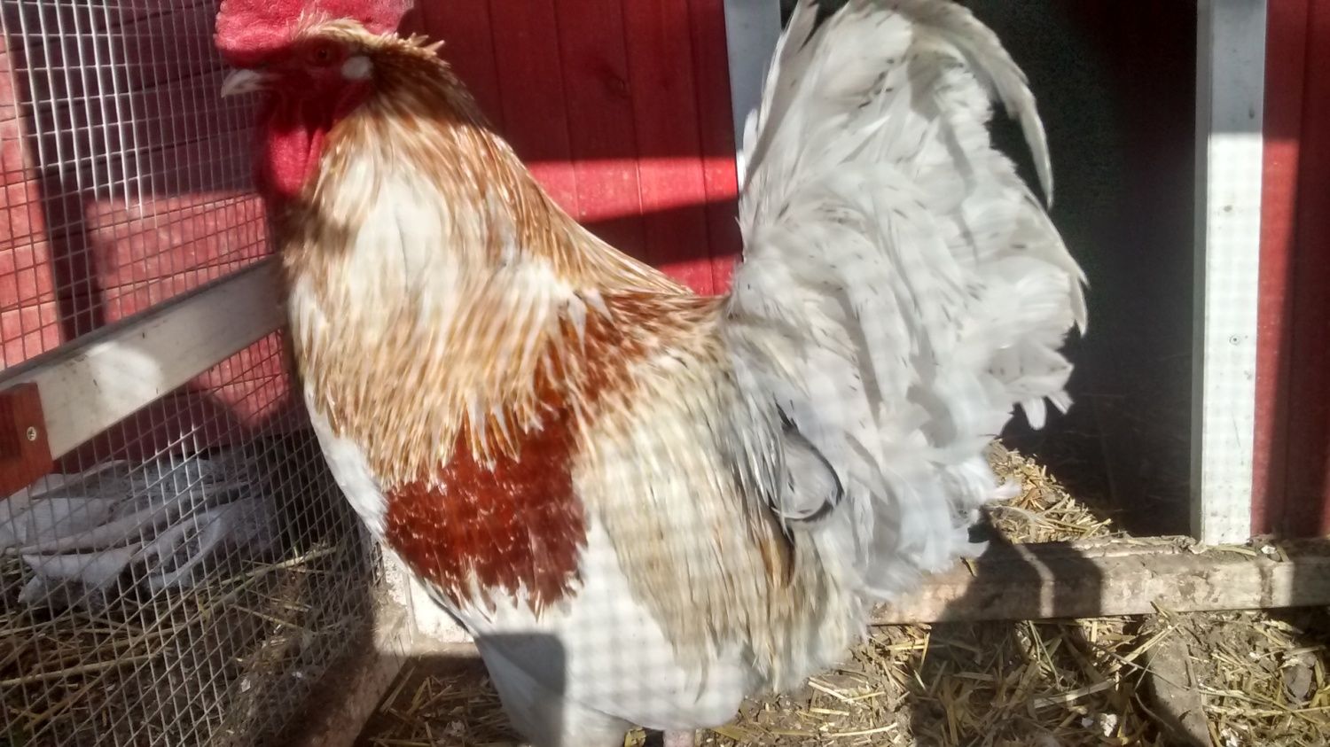 x2He's a mix, mixed enough no specific breed stands out. I was thinking red sex link, but is his tail really that blue/grey color? How pretty!